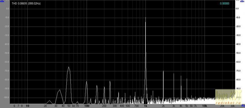 После контрольного прослушивания усилителя была вновь произведена модернизация выходного каскада УНЧ. Модернизированный вариант усилителя показан на схеме ниже. По схеме видно, что в катоды ламп выходного каскада был установлен так называемый прецизионный отражатель тока. Данный отражатель тока имеет повышенную точность (по сравнению с классическим токовым зеркалом) за счёт добавления базового тока транзистора VT4 (равного базовому току VT3) к выходному току транзистора VT2. Для устранения глубокой местной ООС со стороны катода токовое зеркало так же было дополнительно шунтировано конденсаторами С9, С10. Требования по обеспечению адекватной работы токового зеркала аналогичны предыдущим вариантам усилителя. Настройка выходного каскада данного варианта усилителя полностью аналогична настройке предыдущих вариантов усилителя, за исключением того, что токи покоя устанавливаются подбором резистора R16, а ассиметрия токов плеч устраняется подбором резистора R14. После настройки усилителя было так же произведено измерение основных параметров усилителя. На скрине ниже представлен спектр сигнала на выходе усилителя при номинальной выходной мощности равной 8 Вт.   По скрину видно, что суммарный коэффициент гармоник грубо равен 0.57%, а уровень самой высокой гармоники 2-ой, грубо равен -51 дБ. На скрине ниже представлен спектр сигнала на выходе усилителя при выходной мощности равной 6 Вт.   По спектру видно, что суммарный коэффициент гармоник грубо равен 0.27%, а уровень самой высокой гармоники, 2-ой (и примерно такой же 3-ей), грубо равен -60 дБ. На скрине далее показан спектр сигнала на выходе усилителя при выходной мощности равной 3 Вт.   По скрину видно, что суммарный коэффициент гармоник грубо равен 0.09%, а уровень самой высокой гармоники 2-ой, грубо равен -70 дБ. После превышения выходной мощности равной 16 Вт усилитель начинает плавно входить в ограничение сигнала (клипинг). В таком режиме усилитель способен развивать на выходе мощность равнуую 16 Вт. Спектр сигнала на выходе усилителя в таком режиме работы представлен на спектре ниже.   По спектру видно, что суммарный коэффициент гармоник грубо равен 2.51%, а уровень самой высокой гармоники, 5-ой, грубо равен -32 дБ. Что же касается стабильности тока покоя, то при изменении выходной мощности от 0 до максимальной мощности ток покоя одного плеча изменяется от 32.3 до 42.9 мА, а второго плеча от 29.2 до 39.3 мА т.е. в одном плече ток покоя изменяется всего на 10.6 мА, а во втором на 10.1 мА, что подтверждает нормальную работу отражателя тока. Разбаланс плеч во время работы усилителя составляет около 0.5 мА. Абсолютное изменение тока покоя прецизионного отражателя тока при изменении выходной мощности по сравнению с предыдущими вариантами усилителя несколько выше. Предполагаю это связано с разбросом статического коэффициента усиления транзисторов VT1-VT4 данного отражателя тока, а так же с различием температурного режима данных транзисторов. Переменная составляющая тока анода при этом изменяется в одном плече от 0 до 53.2 мА (действующего значения) и от 0 до 54.6 мА (действующего значения) во втором плече. Разбаланс плеч по переменному току связан с разбросом характеристих радиоламп выходного каскада Ла2, Ла3. По приведённым измерениям можно сделать вывод о том, что в целом линейность усилителя c прецизионным отражателем тока