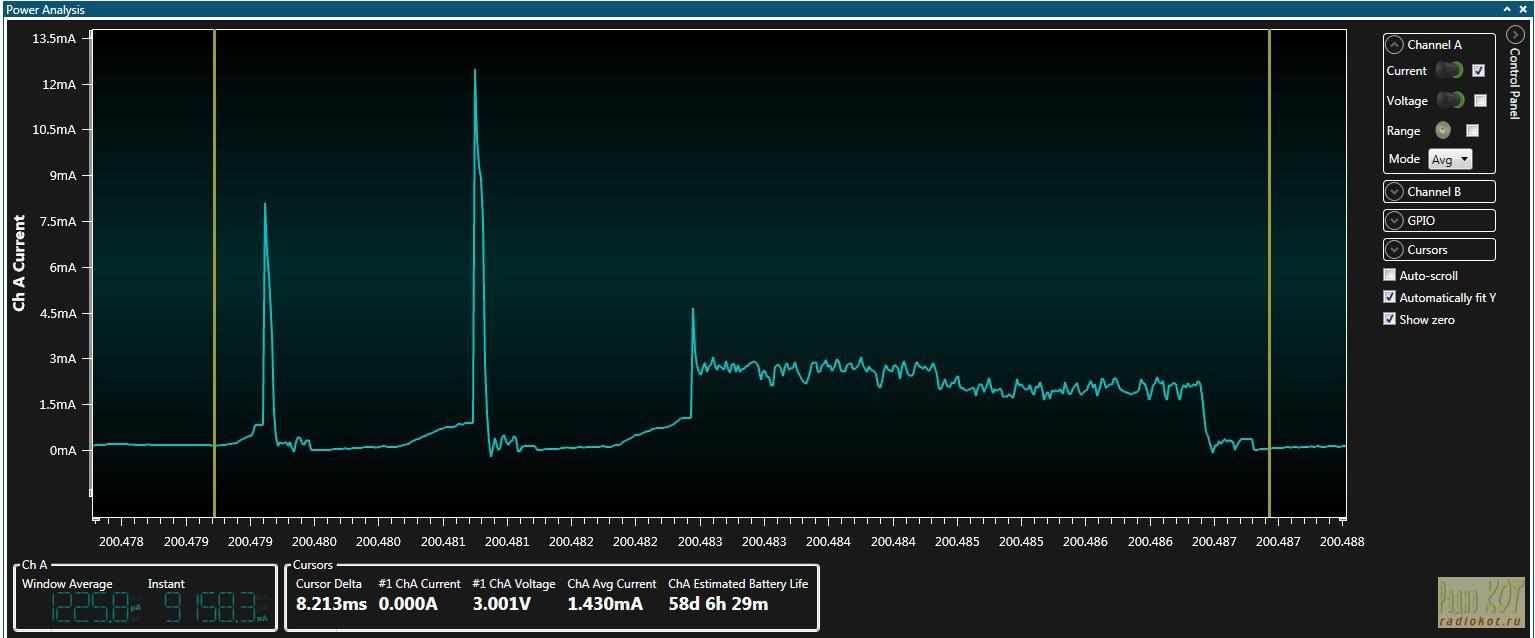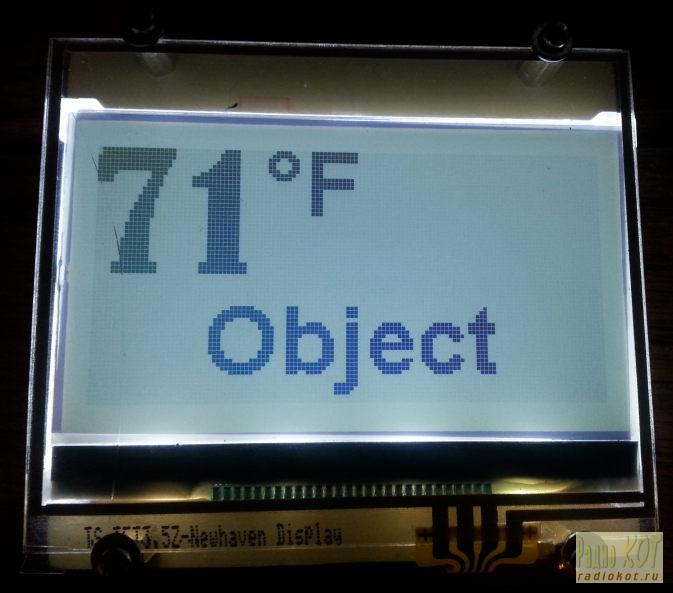 Одним из основных вопросов является насколько велико токопотребление такой системы при батарейном питании. Измеренное потребление самого контроллера IC1 с подключённой панелью в момент нажатия на неё показано ниже. В промежутках между касаниями панели микросхема погружается в глубой сон с субмикроамперным потреблением. Мой тестер в режиме 200 мкА показывал 0. Я не мог поверить в это пока не подключил использованный выше Atmel Power Debugger. Однако, и он показал 0 (т.е. ниже его порога разрешения). Видимо, микросхема пробуждается от перепада напряжений на входах, вызванных касанием. Таким образом, её вполне можно использовать для включения устройства при касании панели в любой точке без потери энергии батареи на ожидание касания. Ниже показано потребление всей схемы при касании. После чтения измерений из IC1 МК производит вычисление координат точки касания и коммуникацию с драйвером ЖКИ. Этим объясняется дополнительное потребление после двух пиков на графике. Однако в промежутках между касаниями среднее токопотребление схемы определяется лишь драйвером ЖКИ и получилось около 13 мкА, как показывает следующий график. Использование резистивной панели в одном из законченных устройств было реализовано моим студентом Майклом ЛаВэлли. У него в доме имеется помещение, которое он оборудовал под хранение вин. Известно, что для полного наслаждения букетом восприятия вина его следует сервировать при определённой температуре, зависящей от типа вина. Для оперативного определения температуры винных бытылок была собрана следующая схема инфракрасного термометра по следам опубликованной здесь конструкции [3]. Само измерение температуры производится датчиком IC2. Однако, на этот раз вместо кнопочного интерфейса с пользователем использована резистивная сенсорная панель фирмы Newhaven Display International, установленная поверх ЖКИ HG1. Эта модель панели была выбрана потому, что она хорошо соответствует размерам экрана графического 128×64 ЖКИ той-же фирмы. Включение схемы производится касанием панели в любой точке, а выключение – автоматически после минуты неактивности.