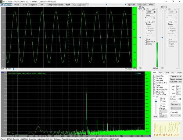 Автор: Sobiratel_sxem Visual Analyser. Краткий обзор Очень часто для качественной настройки различной аудиотехники необходимо наличие у радиолюбителя целого комплекта измерительной аппаратуры. Увы, но из-за высокой стоимости хорошая измерительная аппаратура радиолюбителям практически недоступна. В связи с этим, последние годы широкое распространение получили измерительные комплексы на основе ПК. Данный цикл статей я хотел бы посвятить как раз одному из таких комплексов, а именно комплексу с использованием программного обеспечения Visual Analyser, результаты работы которого Вы многократно могли видеть в моих статьях. Эту статью не мешало бы начать со слов - "Наконец-то!!!! Свершилось!!!" вместо вступления т.к. в мае будет ровно год с того момента, как я обещаю и собираюсь написать данный цикл статей... В общем всё несколько затянулось... Это было небольшое лирическое отступление. Теперь, пожалуй, начнём. Итак, для построения измерительного комплекса нам потребуется ПК с рабочей звуковой картой, и непосредственно программное обеспечение Visual Analyser, которое можно скачать с официального сайта автора [1]. Данное программное обеспечение является полностью бесплатным и достаточно простым в освоении, что и послужило основными причинами, по которым я выбрал именно его. 1. Двухканальный осциллограф. Каналы осциллографа можно отобразить как одновременно так и раздельно. Дополнительно доступен режим работы ХУ, а так же операции суммирования и вычитания каналов с выводом результата на экран. 2. Анализатор спектра. Анализатор имеет амплитудный и фазовый дисплеи, а так же возможность выбора линейного либо логарифмического масштабов как для оси частот так и для оси амплитуд. Дополнительно возможно произвести усреднение спектра по результатам нескольких вычислений, а так же применить различные сглаживающие оконные функции. 3. Многофункциональный генератор сигналов. Генератор способен генерировать синусоиду, синусоидальный сигнал со скользящей частотой, треугольный сигнал, прямоугольный сигнал, последовательность прямоугольных импульсов с настраиваемой длительностью и паузой, белый шум, сигнал с пользовательскими характеристиками, а так же положительный и отрицательный перепады «постоянного» напряжения (ступеньку). 4. Частотомер. Частотомер способен измерять как генерируемую частоту так и период (в мс.). Имеется возможность приостановки процесса измерения. 5. Вольтметр. Вольтметр способен измерять истинное среднеквадратическое значение запряжения, среднее значение, размах (от пика до пика), постоянную составляющую. Отображение результата производится в Вольтах, милливольтах либо децибелах. 6. Набор фильтров. В набор фильтров входят следующие фильтры: ФНЧ, ФВЧ, ПФ, РФ (режекторный фильтр), диодное выпрямление, удаление постоянной составляющей, а так же пользовательский КИХ-фильтр. Данные фильтры можно независимо настроить и применить для каждого канала в отдельности. 7. Частотная компенсация. Программа позволяет создавать и редактировать пользовательские АЧХ, а так же добавлять их спектр в анализатор спектра. Компенсационные АЧХ можно создать и применить для каждого канала в отдельности. 8. Запись и воспроизведение WAV-файлов. 9. Поддержка 8, 16 и 24 битных звуковых карт. 10. Практически неограниченная частота дискретизации. Наивысшая частота дискретизации