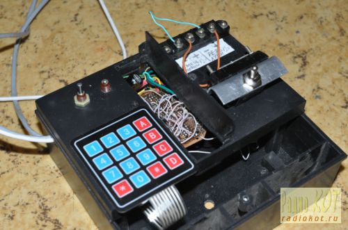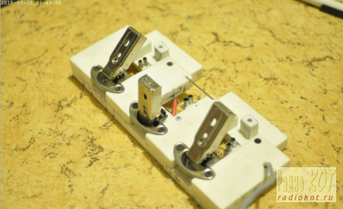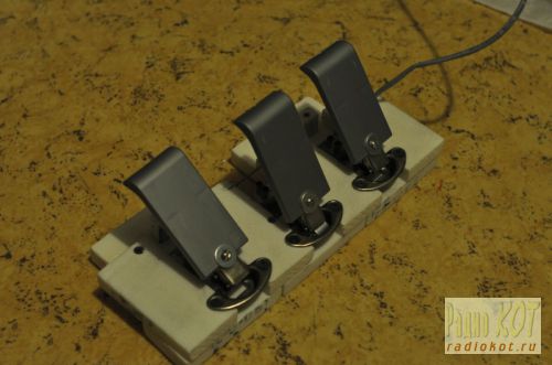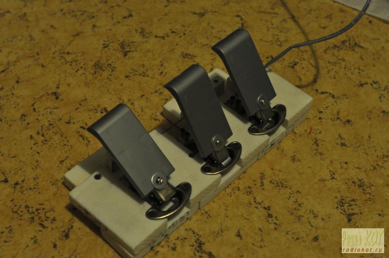 Если с самим контроллером все более-менее ясно, то остается вопрос - как сделать на нем коробку передач, не прибегая ни к каким слесарным работам? Можно взять три трехпозиционных мощных тумблера ON-OFF-ON. Два из них вмонтированы в корпус, а третий прикреплен непосредственно к их ручкам с помощью несложной конструкции из алюминиевого уголка и зажимающей пластинки. Провода от него идут гибкие МГТФ и заходят в отверстия корпуса. Причем, направление переключения у первого и второго тумблера одинаковое, а у третьего - перпендикулярно двум остальным.