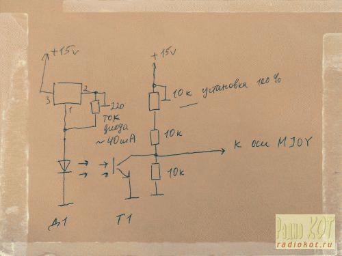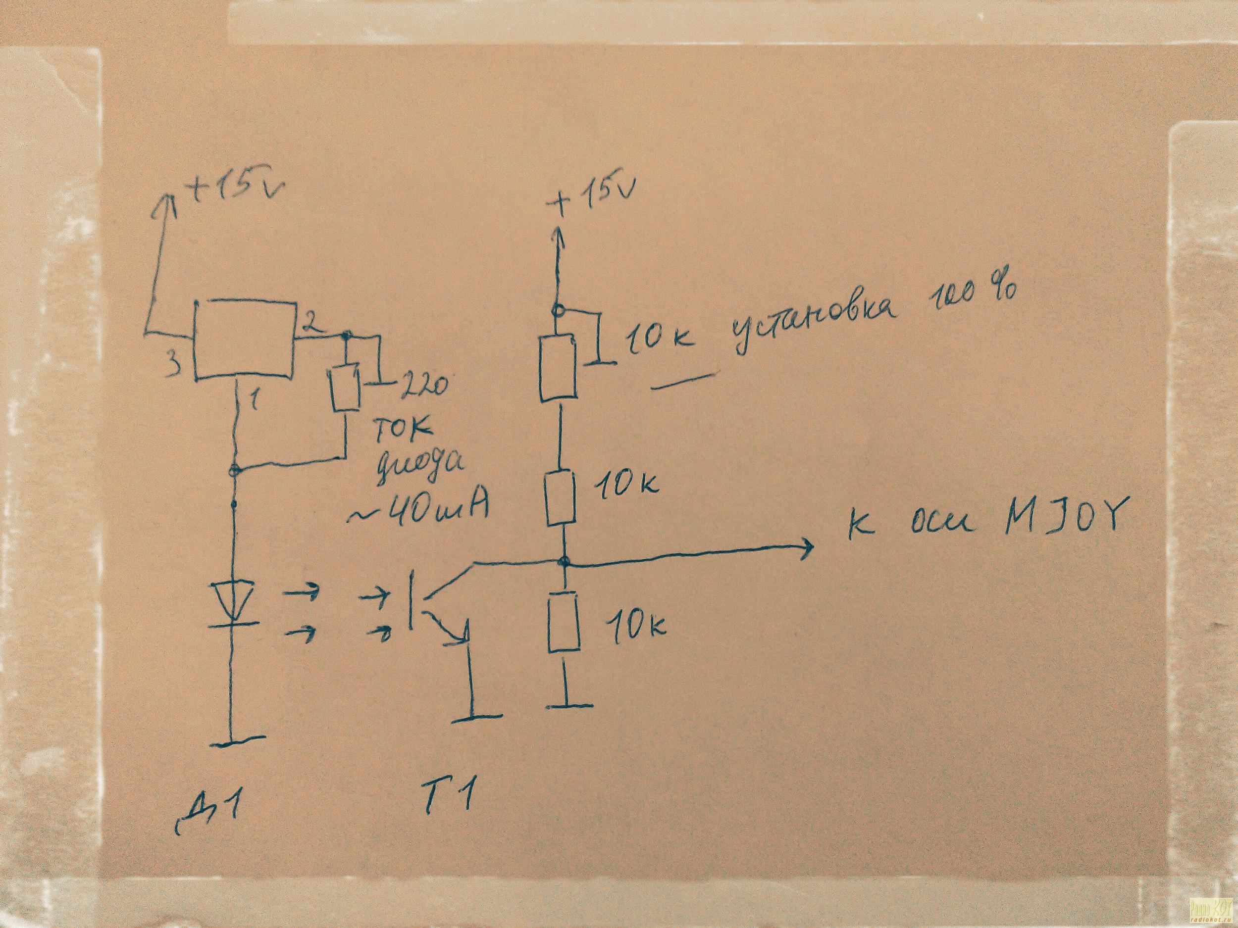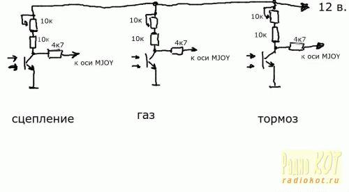 При нажатии педали фототранзистор открывается, и на входе оси контроллера оказывается напряжение, близкое к нулю. При закрытом фототранзисторе максимальное напряжение устанавливается подстроечными резисторами, оно должно быть 5 вольт. Чтобы реализовать механизм сцепления, достаточно знать о положении педали сцепления (напряжение на входе соответствующей оси), а также иметь возможность воздействовать на напряжения на других осях, т.е. подтягивать входы к "плюсу". Чтобы заблокировать действие педалей газа или тормоза, достаточно просто подтянуть соответствующий вход к +5 вольт через оптопару, например.