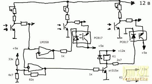 В качестве датчиков будут выступать ИК-диоды и фототранзисторы, зафиксированные относительно друг друга и "смотрящие" в одном направлении. Когда к ним будет приближаться поверхность, отражающая ИК-лучи, фототранзистор начнет пропускать ток. Сама дверная петля и будет отражать излучение. В крайней точке фототранзистор закрыт, но по мере того как петля будет приближаться к датчику, меняя угол, он будет открываться все больше. Оба оптоэлектронных элемента должны быть защищены от засветок и влияния друг на друга - обмотаны фольгой с клеем.