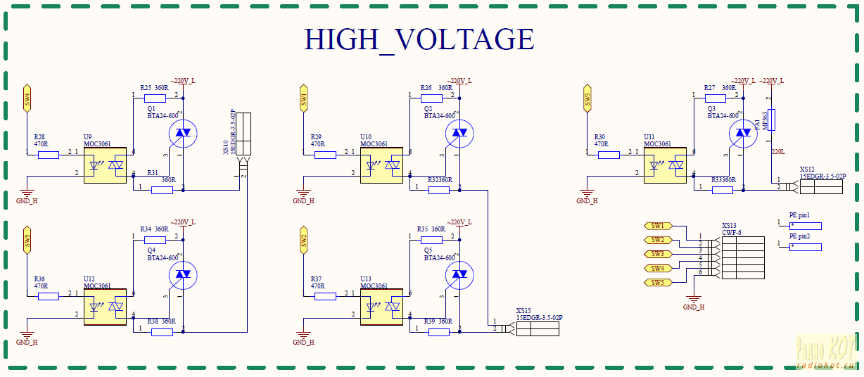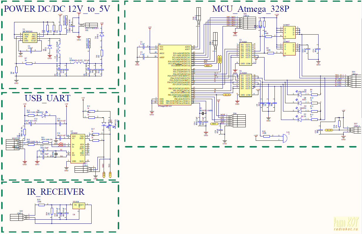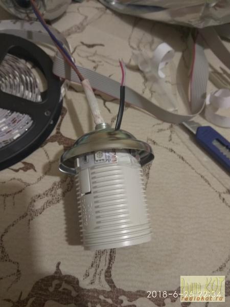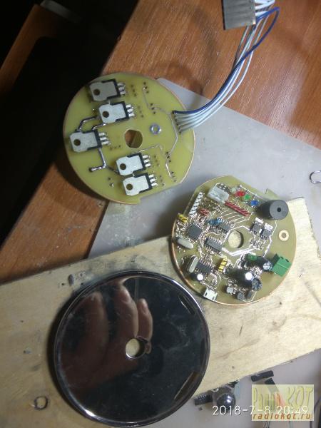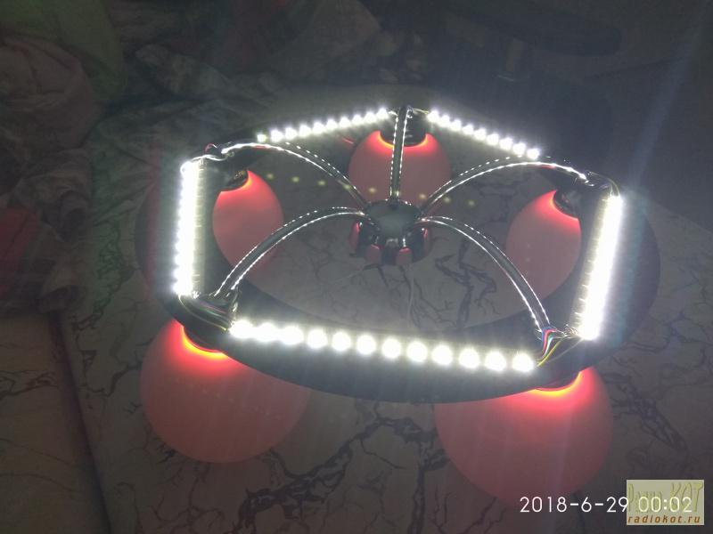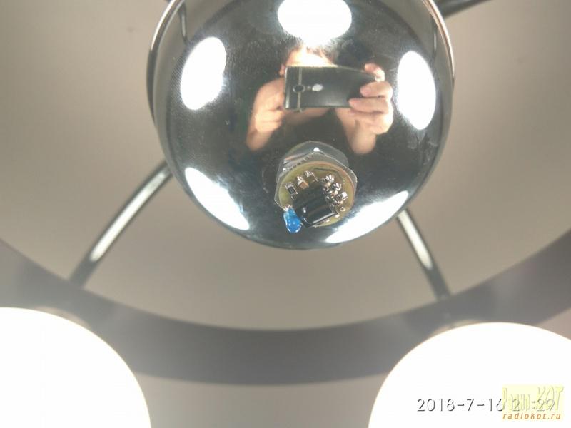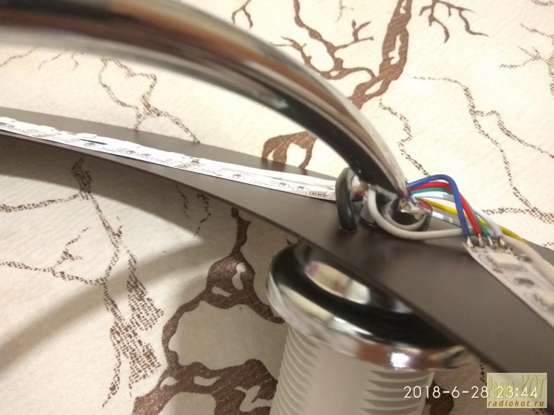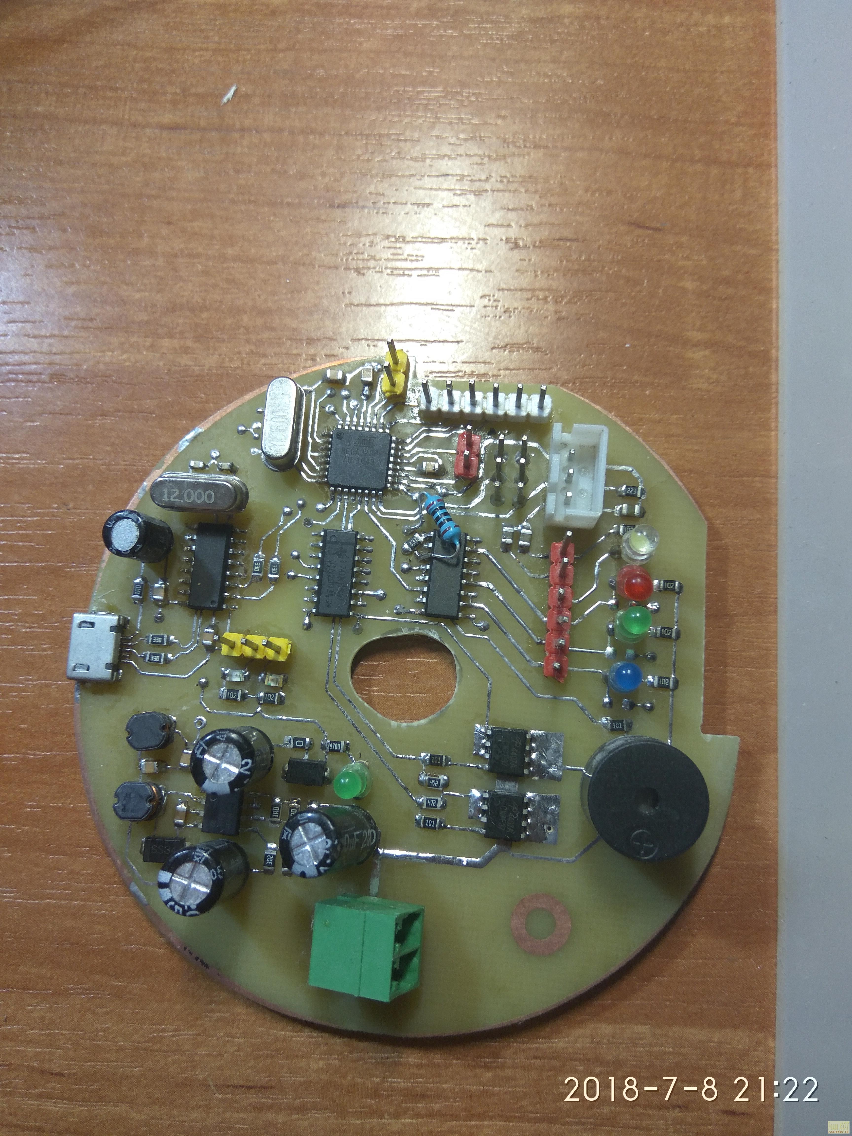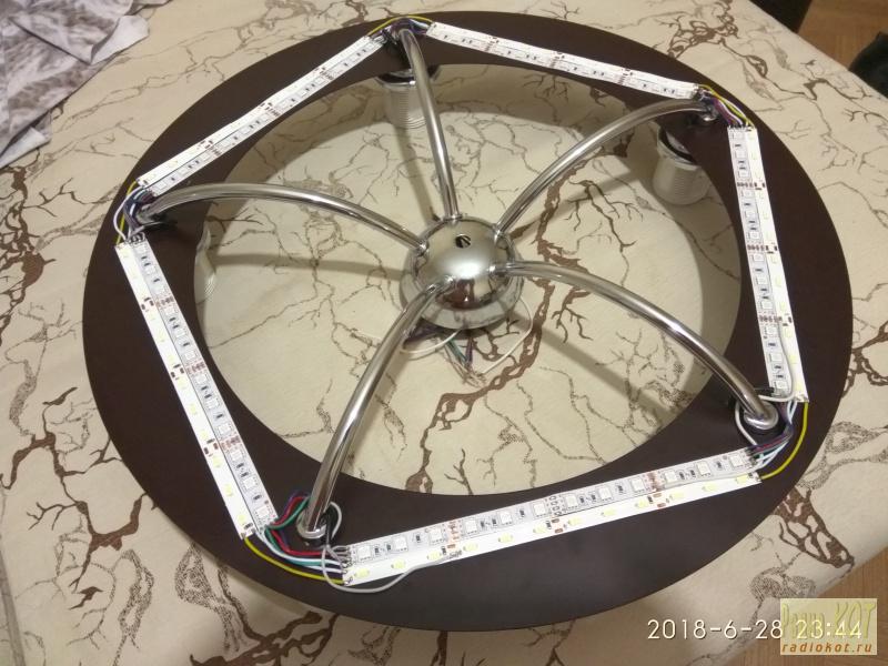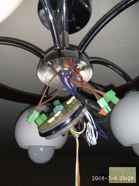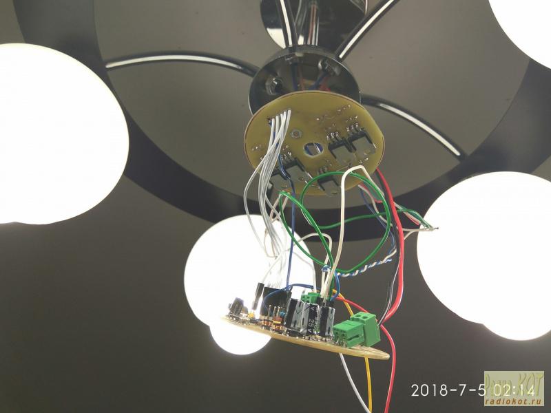 Автор: Deadhunters Дистанционное управление RGB люстрой. Где-то, года два назад, родилась у меня идея сделать люстру с дистанционным управлением. Тогда я только начинал разбираться в электронике, и далось мне это нелегко. Сделал корявую плату с релюшкой, которая включала и выключала лампочку (люстры тогда не было), а потом прикрутил туда же транзистор и белый огрызок светодиодной ленты. Вроде получилось, и плата успешно проработала пару месяцев, пока не произошел "БАБАХ" - взорвалась плата от зарядки телефона, которая питала все это дело. После этого была сделана вторая версия платы, которая проработала полгода. На борту уже была пьезо пищалка и пару светодиодов для различной индикации, реле было заменено на симистор в связке с оптосимистором - мой первый опыт применения данных компонентов, кстати. Питалось все это дело от миниатюрного китайского AC/DC 12В 400мА. И вот этой весной была приобретена люстра, и, естественно, моя плата туда не помещалась. Значит нужна новая плата, а еще ведь и люстра должна получиться самой оригинальной и максимально технологичной. Сказано - сделано! Глядя на люстру, сразу представил, какой она должна стать. Начало бессонным ночам было положено. Сперва необходимо было доработать "механику" - установить RGB светодиодную ленту 5050 в паре с обычной белой 5630, обе ленты наклеены на верхнюю часть люстры. Провода проведены через крепежные трубки: Были доработаны плафоны: внутри каждого, на сам патрон, была накленна RGB лента, просверлено отверстие в защитном колпачке, провода выведены наверх и подключены к соответсвующим пинам RGB ленты, а + 12в питания подключен к +12в питания белой ленты. Таким образом, мы используем всего 3 канала ШИМ и можем переключать подсветку между основной RGB лентой и подсветкой плафонов. После частичной сборки были проведены первые испытания. И дааа, результат был потрясающим, особенно порадовала подсветка плафонов. Ожидания оправдались, появился дополнительный стимул продолжить работу. Теперь необходимо было выбрать источник питания. И тут снова на помощь пришли китайцы - NES 15-12 (12в, 1.3А). БП был установлен в основание люстры, к сожалению, фото не сделал, но поверьте, он туда поместился. Пришлось, правда, удалить одну половину корпуса БП, т.к. он упирался в сам стержень с гайкой, на котором висит люстра, и теперь стержень частично заходит в пространоство БП (все масимально заизолировано). А как же вентиляция, спросите вы? Да, с вентиляцией дела не очень, но пока сбоев в работе не было (работает уже 3 месяца). После всей проделанной работы люстра была установлена на свое место, а мне оставалось самое сложное: придумать плату, которая поместится в центральную полусферу люстры, да еще и с огромным отверстием в центре, под центральный соединительный шток. Т.к люстра задумывалась максимально оригинальной и навороченной (в меру моей фанатазии конечно), было решено сделать возможным включение и отключение каждой лампочки по отдельности, + 3 канала ШИМ для RGB ленты, 1 канал ШИМ для белой ленты, коммутация +12в, обязательно нужна пищалка и индикация работы. Учитывая опыт с предыдущей платой, каждый раз, если хотелось добавить что-то новое в прошивку, приходилось снимать плату, было решено добавить USB интерфейс, для прошивки со смартфона/планшета. В итоге получилась такая вот схема: Не знаю, как так вышло, но забыл подключить RESET 