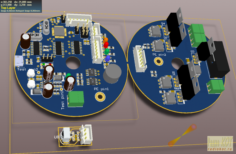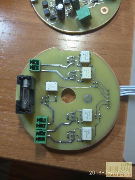 Теперь осталось то, чего совсем не хочется делать - трассировка платы... Т.к. данное количество компонентов не получалось уместить на одной плате, было решено делать две: управляющая и силовая, для коммутации исключительно лампочек 220В. Еще пару бессонных ночей и миру явилась 3D модель будущего творения: Плату делал обычным ЛУТом, на мой взгляд, получилось хорошо и с первой попытки. После напайки всех компонентов и прошивки бутлоадера через USBasp, я попытался прошить через microUSB, но вот тут и обнаружилась засада с DTR - 0.1 мкФ - RST. Ну чтож, значит будем шить по старинке - снимая плату. Представляю вашему вниманию свое творение: Фото силовой платы: Центральная часть люстры состоит из двух полусфер, разделенных между собой металоческой пластиной (на фото выше пластина попала в кадр). Силовую часть было решено засунуть за пластину, а управляющую снизу, чтобы был быстрый доступ. В качестве изолятора между платами и пластиной идеально подошли пластиковые крышки от чипсов "Pringles":