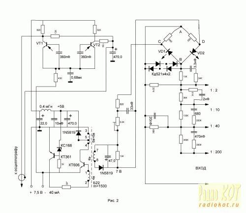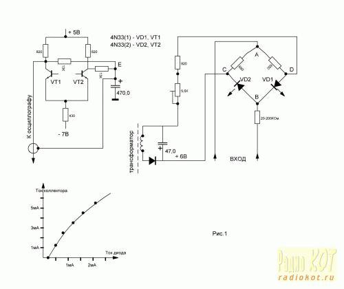 При настройке устройств для сети 220В часто хочется увидеть результат работы,- моменты отсечек, выбросы напряжения, искажения синусоиды или меандра. Но использовать осциллограф с автономным питанием не хочется,- из-за случайно не учтенной утечки дорогой прибор может быть мгновенно и безвозвратно выведен из строя. Он и не решит проблемы,- при пробое символической изоляции его корпуса можно оказаться под напряжением. При таких измерениях лучше использовать развязку с помощью линейных оптопар или ШИМ преобразователя. А если под рукой не окажется готовых решений или необходимых деталей, можно обойтись и чем-нибудь попроще. Например распространенными оптопарами 4N33, включенными не совсем обычным образом; собранная на них мостовая схема оказалась настолько не плоха, что возникло желание поделиться ей и попытаться понять ее работу . Излучатели оптопары и резисторы образуют мост, в диагональ A-B которого подается измеряемое напряжение, в другую, C-D- смещение для ик-диодов. Если мост сбалансирован (когда измеряемый сигнал не велик), напряжения друг на друга не влияют. Транзисторы оптопар включены по схеме дифференциального усилителя. Небольшие токи в диагонали A-B меняют ток через диоды оптопар противоположным образом, что в свою очередь изменяет ток транзисторов и усиленное напряжение снимается с коллекторной нагрузки одного из них. Коэффициент передачи такой схемы оказался около нескольких В/мА, линейность амплитудной характеристики до +/- 1В, что позволяет рассмотреть осциллограмму. При этом сохраняется постоянная составляющая входного напряжения. Почти все детали относятся к входному делителю и преобразователю напряжения. Чтобы не рисовать длинных соединений, оптопары изображены раздельно, VT1,VD1-первая , VT2,VD2- вторая. К частотным свойствам не предъявлялось особых требований, поэтому полоса пропускания развязки составляет от ноля до 1000 Гц, коррекция АЧХ делителя нужна для компенсации емкости монтажа высокоомных цепей и компенсации ухудшения частотных свойств оптопары при малых токах и большом сопротивлении в цепи коллектора (см. дейташит). Для уменьшения наводки от преобразователя в цепи база-эмиттер транзисторов включены блокирующие конденсаторы. Переменное сопротивление служит для регулировки тока смещения излучателей оптопар и установки в точке Е напряжения примерно равного потенциалу на общем проводе опторазвязки (где соединяются -5В и +7В),- точность здесь не требуется. Схема преобразователя взята из интернета, для питания развязки используются два последовательно включенных Li-Ion аккумулятора самой маленькой емкости. Главное, получше изолировать обмотку преобразователя 8-7, питающую цепь смещения излучающих диодов. Класс точности деталей входного делителя не имеет значения, они требуют подбора и доводки импульсной характеристики на собранной схеме (если необходимо). Несмотря на изоляцию опторазвязки, слабые емкостные связи остаются, поэтому провод от точки А входного моста желательно подсоединять к нулевому проводу (который не разрывается тиристором или транзистором), иначе входная цепь развязки будет под пульсирующим напряжением + , - 310В (для сети 220В) и коммутация будет сопровождаться короткими импульсами на входе осциллографа.
