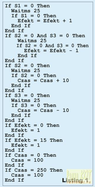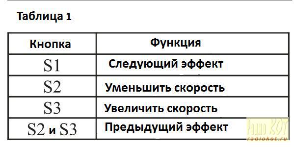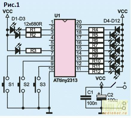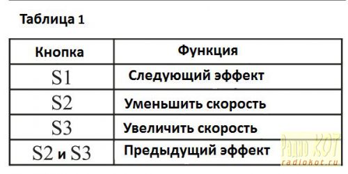 Автор: Biktop95 Основной целью этого проекта было добиться простоты и высокой функциональности. Система оснащена Работа схемы Принципиальная схема показана на рис. 1. Сердцем схемы является микроконтроллер AVR ATtiny2313 с флэш-памятью 2 КБ. Кнопки S1-S3 использованы для возможностей настройки эффекта и скорости каждогоиз них.Таблица 2 показывает использование кнопок. Если нажать кнопку S1 и не отпускать ее, то эффекты каждые 3 секунды будут сменять друг друга.Также при нажатии S3 скорость постепенно нарастает,а при нажатии S2-постепенно снижается.Одновременное нажатие кнопок S2 и S3 приводит к выводу предыдущего зффекта.Тип эффекта и скорость могут быть установлены в любое время - эффекты можно увидеть в клипе ,который размещен в youtube по адресу https://youtu.be/NbEvT4TNcpA . 5мм светодиоды D1-D12 подключены через резисторы R1-R12 со значением 680 Ом к линия ввода / вывода микроконтроллера. Для еще большей зрелищности используются светодиоды группами с тремя цветами:красный,зеленый и синий.Всего четыре группы.Синий светодиод можно заменить желтым.