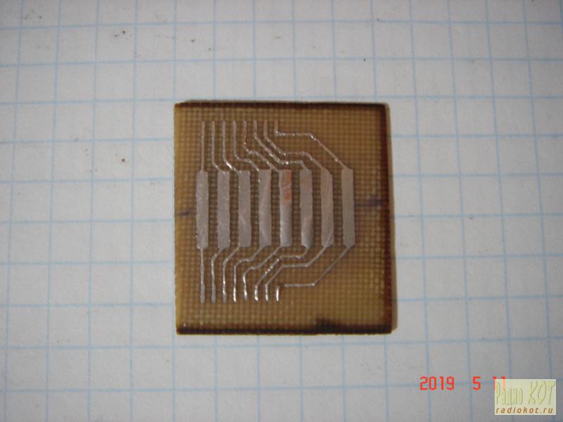 Зато развети в Layoute плату и протравить в "лимонке"- это мы с превиликим удовольствием. А с нашим опытом по времени, ну пол-часа, час. А если ближе к делу, то смысл в том, чтобы паять в выводам микросхемы не проводки, а небольшую платку. Рисуем, утюжим и травим примерно вот такую разводку,