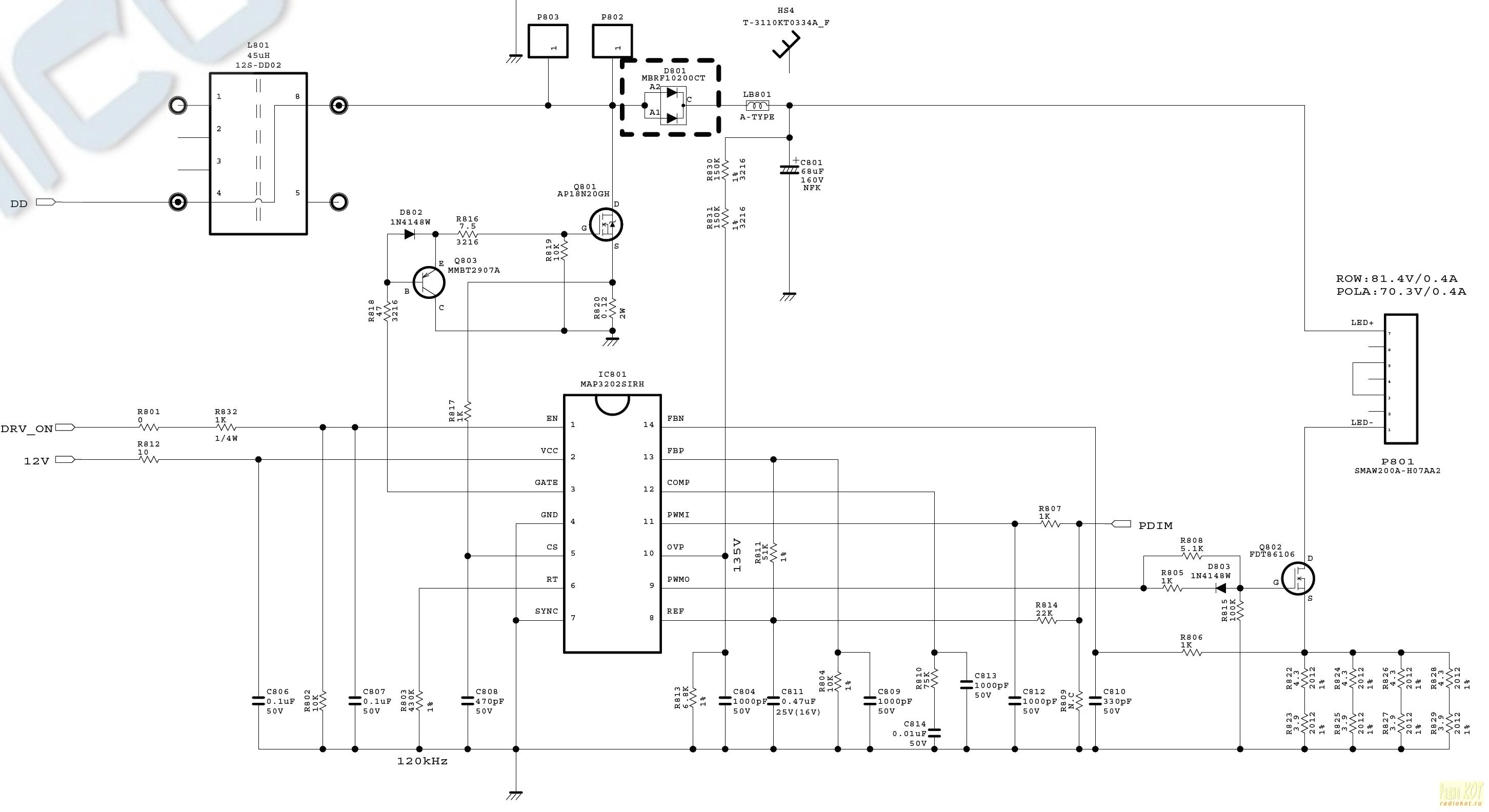 Для этой цели была разработана небольшая схема, преобразующая ШИМ-сигнал управления подсветкой в шунтирующее резистор R804 сопротивление. При этом ни при каких обстоятельствах напряжение на входе FBP микросхемы MAP3202 не должно превышать заданного делителем R811, R814 напряжения 0,81967В, дабы не повредить светодиоды подсветки повышенным током.