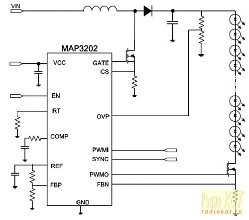 - от превышения напряжения питания цепочки светодиодов (>3В на выводе OVP),