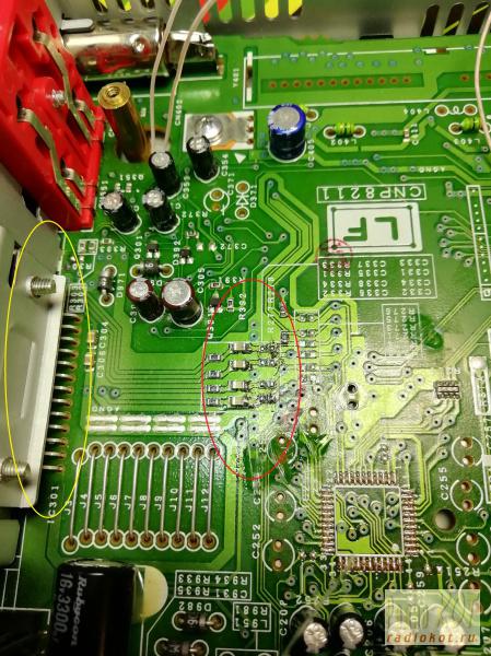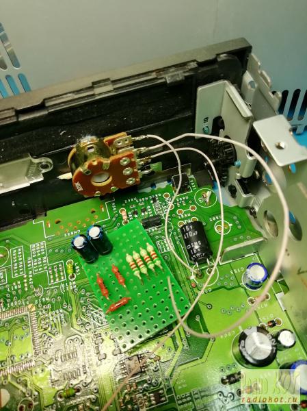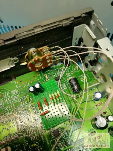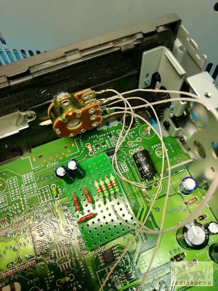 Тут всё, продолжаем... 11) Приложите плату магнитолы на её родное место и посмотрите внимательно: все-ли нужные нам точки находятся на верхней стороне? На всякий случай, вот список точек: контакты центров RCA-разъёмов (нам понадобятся любые 2 из них, пусть это будут с меткой FRONT), точка ACC (красный провод в пункте 9), ножки ST_BY и MUTE, конденсаторы входов in1..in4. Если что-то из перечисленного находится снизу платы - припаивайте монтажный провод и прокладывайте так, что бы после прикручивания платы он не был пережат. Рекомендую около места пайки закрепить провод к плате при помощи суперклея. Так же рекомендую найти на верхней стороны платы точки «массы». Они мультиметром должны звониться накоротко с чёрным проводом в колодке или на корпус магнитолы. Как только все провода окажутся на верхней стороне платы - смело прикручивайте плату. С подготовкой платы всё. Этап пятый: изготовление платы регулировки громкости и баланса.
