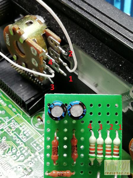 17) Плата готова, осталось дело за малым: правильно вывести звук на усилитель. Соединяйте точку 1 платы регулировки с входом усилителя, отвечающим за передний правый динамик (см. результаты пункта 10), точку 2 — со входом, отвечающим за задний правый динамик. 3- передний левый, 4 — задний левый. Если всё сделано без ошибок, то поворот регулятора балансировки влево до упора переведёт звук на задние динамики, а вправо до упора — на передние. Получится примерно так: Этап седьмой: безопасность.