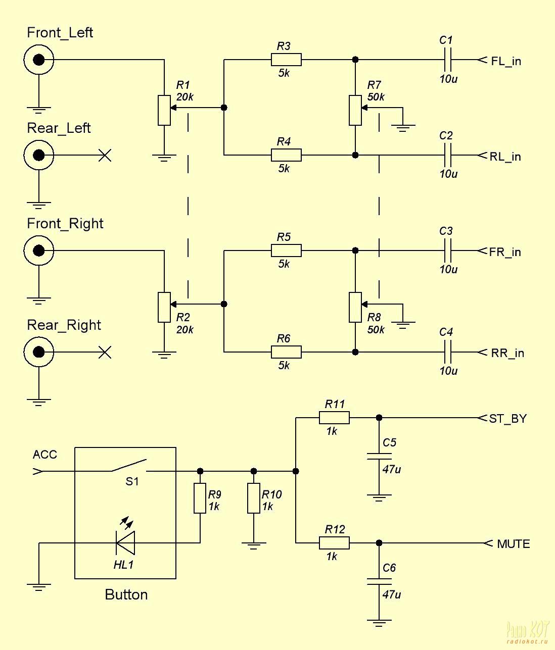 19) Излишки проводов, что бы не болтались внутри магнитолы, рекомендую приклеить скотчем к плате магнитолы и в местах прилегания их к плате капнуть по капельке суперклея на случай, если скотч со временем отклеится. Так же необходимо капнуть по капельке около мест припаивания к плате. Это необходимо что бы уменьшить нагрузку от вибрации на место пайки. 20) Ну вот и всё. Можно захлопывать крышку, гуглить на тему "как включить компьютерный блок питания" и тащить всё в гараж или на дачу... Результат будет выглядеть примерно так: Теперь для тех, у кого магнитола без RCA: необходимо перерезать удлинитель пополам (или кому как удобнее) и использовать половину c RCA-мама. Прозвоните какие из проводов являются центральными жилами и сажайте их в те же точки, куда приходили центральные жилы с разъёмов в п.13. То, что идёт на внешний контакт — это на массу магнитолы. По цветам, обычно разъём правого канала маркируется красным, а левого — белым цветом. Но уж какой купите... В остальном инструкция такая же. Про переменный резистор: в случае переменного резистора 20 кОм на небольшой громкости наблюдается достаточно сильное изменение громкости (процентов 20-30 по амплитуде) при крайних положениях балансировки. Выглядит это примерно так: когда переводим баланс из среднего положения на передние динамики, то сначала плавно притухают задние, а в самом конце немного притухают и передние. Связано это с резистивной делёжкой, которую образует верхнее плечо переменника громкости и малое сопротивление переменника балансировки, заглушающее задний канал. Поэтому рекомендую брать на громкость переменный резистор около 1 кОм. Как проверить ошибки в схеме или как выяснить какой выход на какой динамик пустить? Ответ в вопросе: любым динамиком. Подключайте питание, подключайте только один канал на вход, выкручивайте балансировку в крайнее положение и тыкайтесь по очереди в выходы с магнитолы. Если звук пошёл — легче подписать его и учесть это при прокладывании проводов к динамикам в месте прослушивания. Ну и напоследок, как и обещал, схема того, что сделали. PS пункт 3 может вызвать много споров, но его лучше выполнить, потому что неизвестно кто автор донорской магнитолы и как она себя поведёт и сколько будет потреблять при «любимом» варианте подключения горе-электриков: скрутить красный и жёлтый провода.