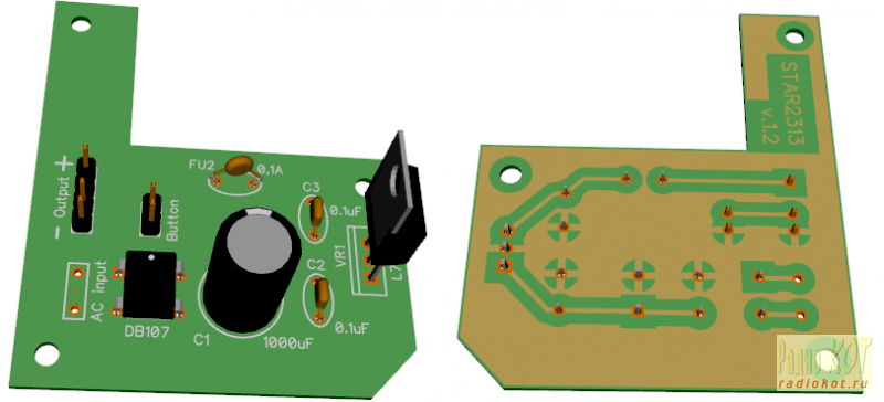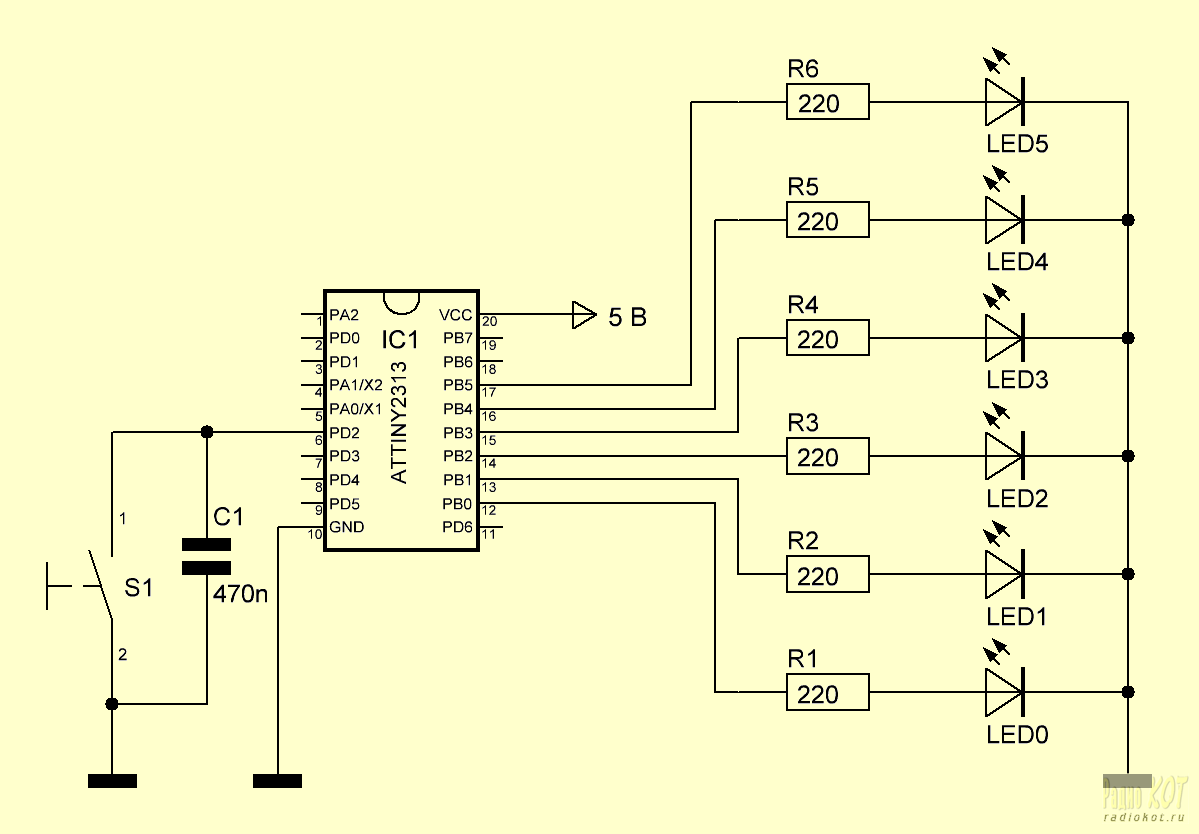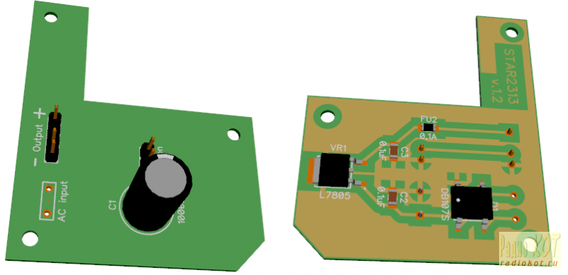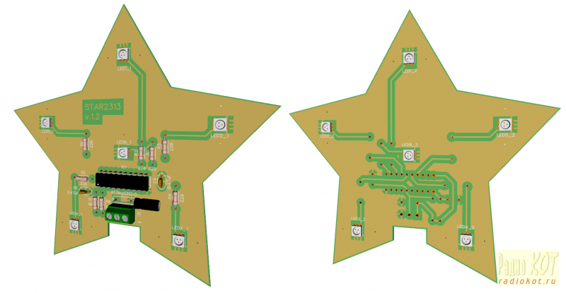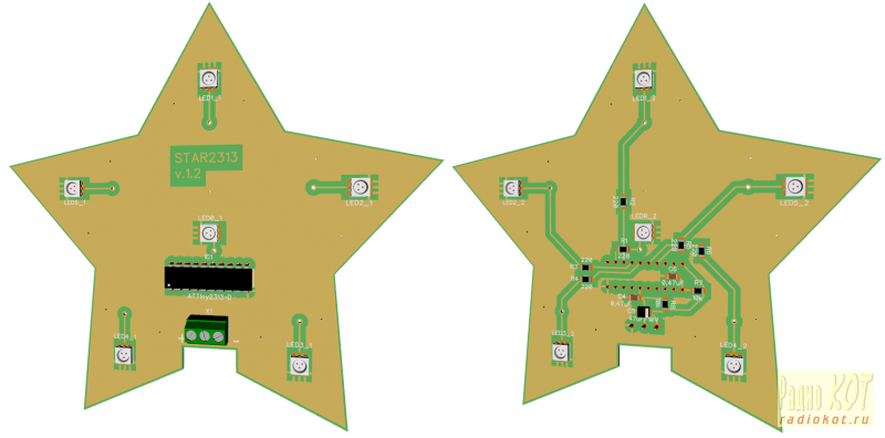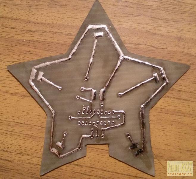 Вариант 1: Звезда на обычных светодиодах Дело было ещё до переделки гирлянды, и об индивидуально адресуемых светодиодах тогда не знал. Недолго думая решил пойти по самому простому (на мой взгляд) пути: мигание светодиодами при помощи микроконтроллера. А чтобы можно было переключаться между режимами работы добавил кнопку. Для управления светодиодами взял "народную" ATTiny2313A. Чтобы максимально упростить себе задачу, все светодиоды подключил через резисторы на выводы одного порта, а кнопку - ко входу прерывания. Опробовал схему с тестовой прошивкой на макетке. Яркость светодиодов получилась чуть выше, чем у лампочек, при этом максимальный ток через МК получился всего 50 мА. Теперь можно было подумать над полной схемой. Для питания звезды задействовал её родной трансформатор. Микроконтроллеру для работы необходимо постоянное напряжение 5 вольт, а значит кроме диодного моста и сглаживающего конденсатора понадобился линейный стабилизатор 7805 с обвязкой. Родная проводка от блока питания до звезды, состоящая из 3-х проводов, позволит без лишних телодвижений разместить кнопку управления в самом блоке. В звезде дополнительно надо подключить электролитический конденсатор для стабильной работы микроконтроллера. Дело было незадолго до нового года, поэтому на скорую руку нарисовал всю разводку лаковым маркером на фольгированном текстолите и протравил. Светодиоды на плате распределил так, чтобы она не отличалась от исходного устройства: 0-й по центру, остальные - в лучах по часовой стрелке начиная с верхнего луча. И вот, уже в процессе лужения обнаружил, что чего-то плате звезды не хватает. А не хватает очень нужной вещи: минусовой линии питания на МК. Забыл нарисовать... Ладно, не переделывать же - припаяю перемычку. Чтобы звезда светилась как раньше, светодиоды припаял с обеих сторон платы, при этом у резисторов вывод на светодиоды является перемычкой между сторонами. Для удобства припаял панельку под микроконтроллер и винтовой клеммник (с шагом 3,81 мм) для провода. Конденсатор впаял между ними в лежачем положении, чтобы он не упирался в корпус звезды. Получилось как-то так: На эти непонятные разводы на плате не обращайте внимания - это я пробовал покрыть её красным цапон-лаком. Но это было бесполезным занятием. Во-первых, цапон-лак был слишком бледным. Во-вторых, плату и так практически не было видно внутри звезды. В плате блока питания ничего необычного, кроме разъёма, облегчающего задачу водружения звезды на верхушку ёлки. Для 7805 радиатор не понадобится, т.к. ток небольшой. Звезда в полностью собранном виде: И всё-таки схема нуждалась в доработке, поэтому окончательный её вариант должен был выглядеть вот так: Что было доработано: