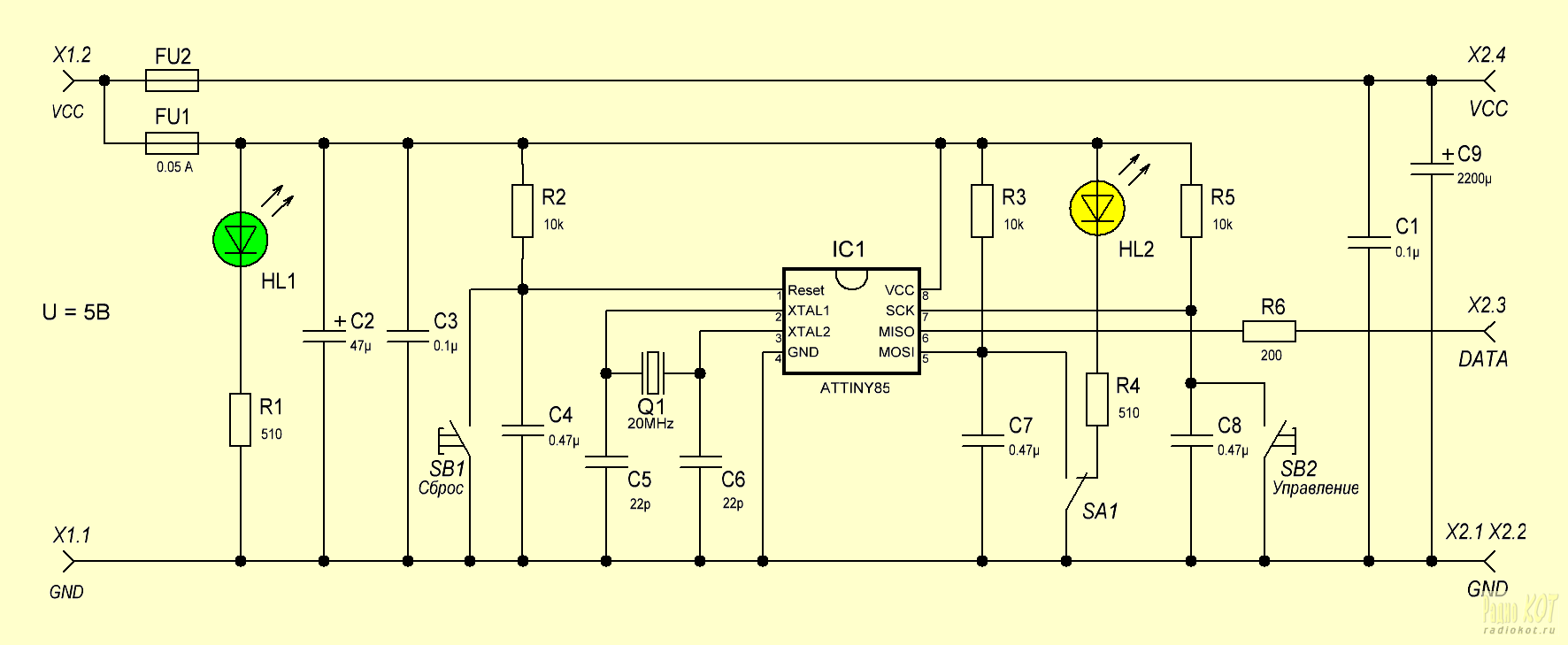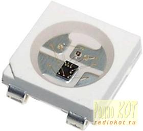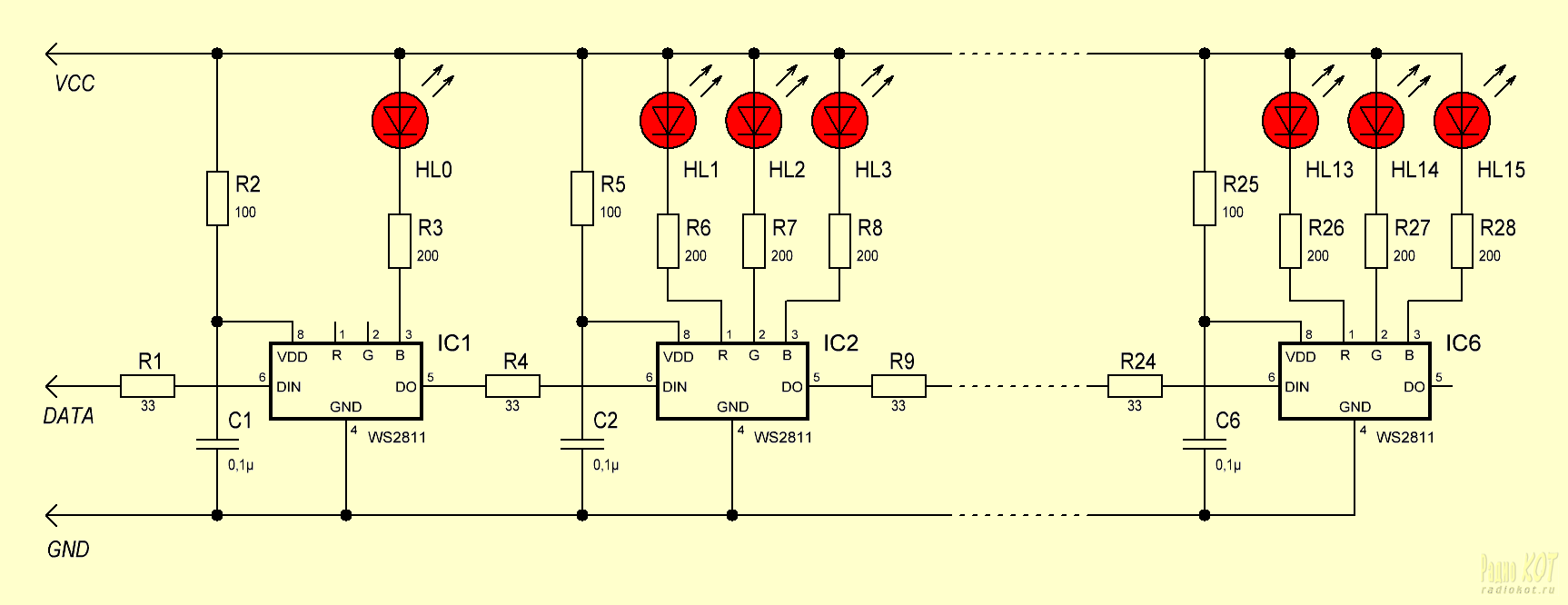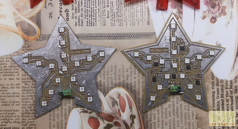 Вариант 2: Звезда на "умных" светодиодах WS Итак, опыт работы с этими светодиодами уже имелся. Да и подключать их к одной линии данных много, значит можно увеличить количество светящихся точек примерно до такого вида: Теперь осталось выбрать на каких именно строить схему - WS2811 или WS2812B? Решено было опробовать в деле оба типа. WS2812B - это чип со светодиодами трёх цветов в одном корпусе, но... У меня звезда красная, соответственно и задействован будет только красный кристалл, а синий и зелёный включать нет смысла. Как результат: две трети передаваемых на светодиоды данных будут балластом с нулями. Схема подключения простейшая. Нужны лишь светодиоды, да керамические конденсаторы на 100 нанофарад. Так выглядит схема каждой из двух сторон платы, которые работают параллельно друг другу. Дополнительно мне понадобились всё тот же разъём и пара резисторов нулевого сопротивления для перемычек. WS2812B оказались не очень удобны в пайке: корпус довольно легко плавится, а припаивать надо каждый вывод отдельно. Проверить эти светодиоды мультиметром не получится, только блоком управления как у гирлянды. И только с начала цепи, иначе сигналу будут мешаться помехи с выхода предыдущего светодиода. После запайки всех деталей подключил плату на проверку и выяснил, что у меня один светодиод "потерял" зелёный кристалл, а ещё один благополучно помер. С помощью сплва Розе и такой-то матери заменил нерабочий светодиод, и подключил снова на проверку. Теперь всё работает как надо. Жаль только что плата греется - значит надо будет ограничить яркость. Да и полная яркость для звезды была чрезмерной по личным ощущеням. Как чуть позже оказалось, это были не все проблемы... Через некоторое время один из светодиодов, прогревшись, завис. В результате одна сторона звезды работает нормально, а на другой - только половина. Ограничение яркости помогло, но рано или поздно он всё равно зависал. Вот уж не знаю, они такие нежные в пайке или попались с браком. WS2811 - это микросхема, в дополнение к которой нужны отдельные светодиоды. Каждая такая микросхема управляет тремя обычными светодиодами по-отдельности и не имеет чётко привязанных цветов. Значит все они могут быть нужного мне красного цвета. Но есть и минус: деталей на плате будет существенно больше. Зато балласта в передаваемых данных будет меньше, и можно будет яркость ограничить аппаратно, что было сделано при помощи резисторов на 200 Ом. Схема для каждой стороны платы: В таком виде первая микросхема управляет одним единственным светодиодом в центре, а остальные - светодиодами в каждом из лучей. Вот так у меня получились платы с обоими типами светодиодов (типоразмер пассивных SMD-компонентов - 1206): Блок управления на базе микроконтроллера ATTiny85, точно такой же как у гирлянды. Принцип работы тот же самый, только прошивка другая. Точнее прошивки, т.к. для каждого типа светодиодов своя прошивка. Номинал предохранителя FU2 - 0.5 А, т.к. все 32 светодиода (по 16 на сторону) при одновременном включении и ограничении максимальной яркости будут потреблять около 350 мА. Fuse-биты такие же, как для гирлянды. Установить или нет Fuse-бит EESAVE для защиты EEPROM от стирания решайте сами, т.к. в EEPROM записывать ничего обязательного не требуется. При этом прошивка использует эту память для хранения рабочих данных, часть из которых можно менять, но об этом чуть позже. Прав
