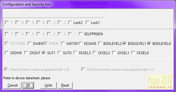 Примерно вот так будут выглядеть доработанные платы звезды и блока питания для выводных и для smd-1206 компонентов (разметка плат в DipTrace во вложениях под статьёй). Микроконтроллер сам по себе работать не будет - ему нужна прошивка. Прошивка для звезды выглядит как сильно пожирневший "Hello, world", и написана для работы на частоте 8 МГц, т.е. можно использовать внутренний тактовый генератор, установленный fuse-битами по умолчанию. Собственно, почти все fuse-биты стандартные, кроме brown-out detection level: Прошивка использует для своей работы EEPROM, но записывать в неё ничего обязательного не требуется. Есть в этой памяти одна ячейка с адресом 0x801, которую можно менять по своему желанию. В этой ячейке хранится время для автоматического переключения между эффектами. Диапазон допустимых значений от 5(0x05) до 250(0xFA) минут. Если выставить значение ячейки 255 или меньше 5, то программа микроконтроллера автоматически изменит его на значение по-умолчанию, т.е. на 10(0x0A) минут. Автопереключение возможно совсем выключить выставив значение ячейки от 251(0xFB) до 254(0xFE). Правильно собранная схема после прошивки микроконтроллера в настройке не нуждается и сразу готова к работе. При включении звезды сначала кратковременно зажигаются и гаснут все светодиоды, после чего запускается последний сохранённый эффект. Если звезда была включена первый раз после прошивки, то запустится 1-й эффект. Всего программ-эффектов в прошивке 19. Их можно последовательно переключать вручную, нажимая на кнопку. Кроме ручного переключения, в прошивке предусмотрено ещё и автоматическое. Оно срабатывает с определённой периодичностью, и переключает на случайно выбранный эффект. Результат изменения эффекта сохраняется в EEPROM. Но при ручном переключении сохранение происходит через 5 минут после изменения, чтобы не тратить в пустую ограниченный ресурс постоянной памяти. Краткая видеодемонстрация эффектов: