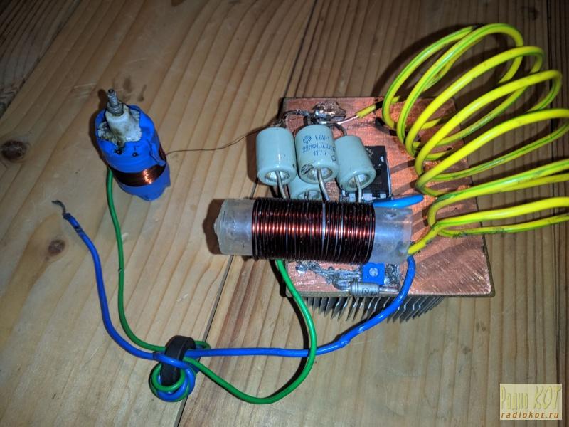 Также вы можете видеть конденсатор установленный между стоком и истоком транзистора. Это так называемый конденсатор класса Е. Он позволяет заставить работать транзистор в режиме с высоким КПД. Почитать подробнее о классах электронных усилителей можно здесь: https://r5am.ru/content/Radio/translations/RF_Power_Amplifiers/RF_Power_Amplifiers.html При правильной настройке в режиме Е на стоке должен быть полусинус. Вот так выглядит работа этой схемы:
