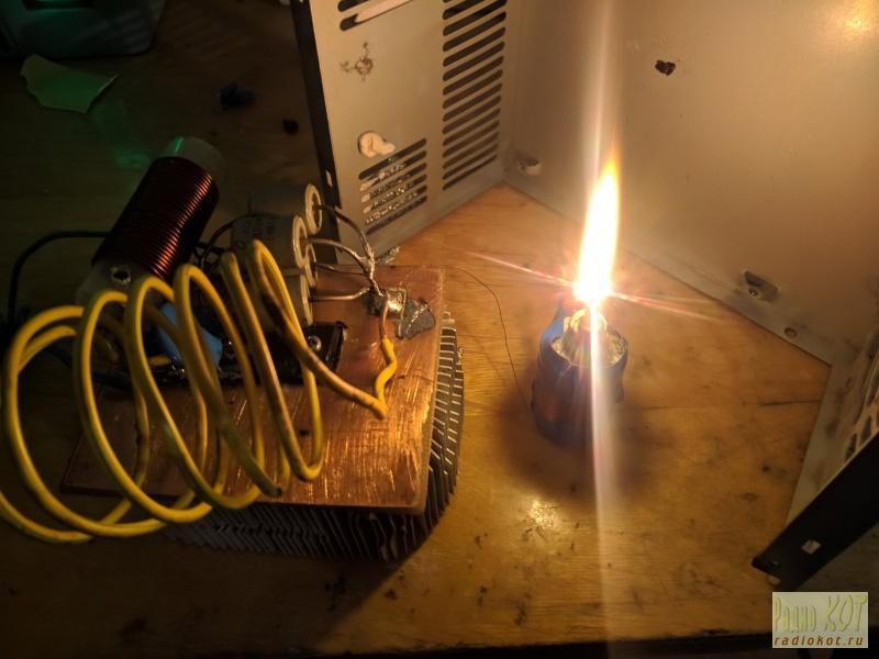 Этих недостатков лишены современные полевые транзисторы, но у них есть некоторые особенности, которые необходимо учитывать при построении высокочастотных генераторов. А именно низкое напряжение, при котором факел гореть не будет и большая ёмкость затвора, которая усложняет их работу на высоких частотах. По этим причинам для получения факельного разряда прозе всего использовать автогенератор (далее факельник). В интернете существует множество схем этих генераторов, но самой распространенной является эта(номиналы неправильные): Она представляет собой схему лампового автогенератора, изменённую для работы с полевыми транзисторами. Также называется генератором Колпитца или емкостной трехточкой. Для работы схемы нужен блок питания с напряжением 30 В и током 6-10 А. Для настройки нужен осциллограф или частотомер. Любой не подойдет. Факельный разряд получается при частоте от 8 МГц, соответственно и осциллограф нужен высокочастотный. Для появления факельного разряда нужен сигнал высокой частоты с амплитудой в несколько киловольт. Напряжение можно повысить с помощью резонатора на 1/4 λ. На второй схеме он обозначен как L1. Считается он как и обычная катушка Теслы. Я считал в программе vctesla. Мотать эту катушку нужно на стекле или на керамике. Неплохо подходят для этого сгоревшие керамические предохранители. Пластик использовать нельзя, он будет сильно нагреваться и катушка расплавится. Также при нагреве резонансная частота катушки уползет и факел исчезнет. При первом включении схемы нужно выставить напряжение смещения. Оно настраивается резистором R3. Нужно подать на схему 15 вольт и повернуть переменный резистор до начала генерации. Схема начнет потреблять ток и будет генерировать ВЧ энергию. Можно поднести неоновую лампу к месту соединения L2 и конденсаторов C1-C4. Она должна загореться. Также можно замкнуть щуп осциллографа с землей и поднести к схеме. На осциллографе должен появиться сигнал. Если схема потребляет большой ток сразу после включения, а генерации нет, то нужно выкрутить резистор так, чтобы напряжение на затворе стало равным нулю и заново выставить смещение. Можно сначала выставить смещение, а потом собрать остальную часть схемы, но напряжения может не хватить для открывания транзистора. Напряжение смещения должно быть от 4 до 5 вольт, оно у всех разное. VD1 лучше поставить на 5 вольт вместо 12. По питанию схемы необходимо установить конденсатор на 10 мкФ и ферритовый фильтр Когда смещение настроено, можно собирать основной контур L2 С1-C4 (для второй схемы). C1-C4 можно заменить одним конденсатором, но он должен обладать большой реактивной мощностью (КВИ, К15У-1). Я использовал конденсаторы типа КВИ-1. Катушка L1 ( с которой горит факел) предназначена для повышения напряжения и рассчитывается как обычный трансформатор Тесла. Для получения факела нужно настроить ее и основной контур в резонанс. Контур состоит из катушки L2 и конденсатора C2. Чем он меньше, тем больше напряжение на затворе и в контуре. Конденсатор C1 является частью ёмкостного делителя C2C1 и подбирается экспериментально (его можно рассчитать, но об этом позже) так, чтобы схема была способна поддерживать нужное напряжение на затворе. Его ёмкость должна быть 1-7 нФ. После какого-то значения генерация может срываться. Подбирать этот конденсатор нужно при напряжении питания 