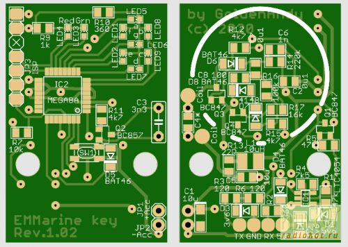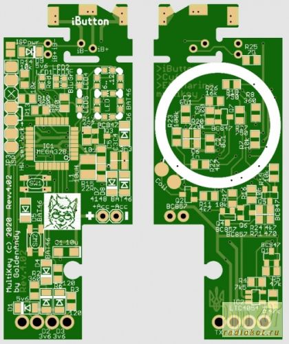 Для ключей Metakom поддерживается только эмуляция (у меня, как и у Кластера, нет такого ключа в наличии. Да и домофонов в округе нет таких. Посему - эмуляция по алгоритму, описанному в документации - см. статью Кластера.) Схема. Немножко про схему. Беспроводная часть работает аналогично первой версии эмулятора и практически ничем от нее не отличается. Работа с контактными ключами. Q6R24 - подтяжка 1Wire-линии к питанию при чтении Dallas-овских ключей TouchMemory. Q4R21 - усиленная подтяжка линии для чтения ключей Cyfral. R13R14 - делитель для компаратора уровней, отдаваемого ключом. Q5 - Прижатие линии к земле в режиме эмуляции TouchMemory. R27,R18 - Эмуляция двух уровней сопротивления Cyfral/Metakom. Добавлено 2 светодиода для индикации единицы в разряде десятков для индикации номеров слотов от 0 до 19. Так же в дополнение к зеленому добавлен синий светодиод - для индикации типа выбранного ключа. Зеленый контактный, синий - бесконтактный ключ. 2 варианта печатной платы под два корпуса: