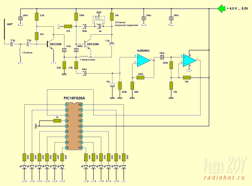 Контролировать работу приемника удобно по шуму высокоомного наушника на выходе компаратора в отсутствие сигнала, подключенному через резистор 2 к ноге 7 операционного усилителя. NJM2904 это то же самое, что и LM358 ( нога к ноге ). Приемная часть сохраняет работоспособность от 4 до 7 вольт ( без микроконтроллера, разумеется, которому 7 вольт много ).