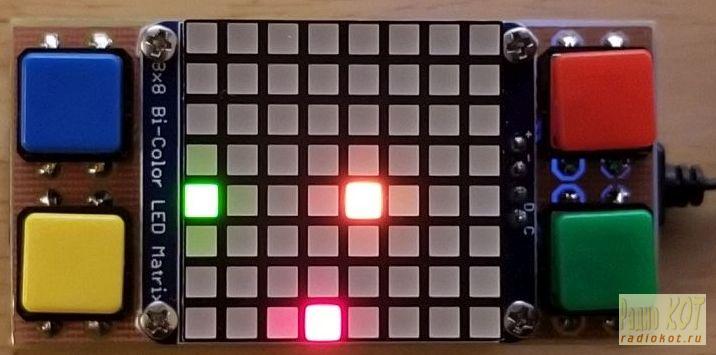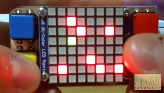 Цвет каждой точки дисплея (красный/оранжевый/зелёный) может быть задан независимо по интерфейсу I2C. Схема платы расширения показана ниже. Кнопки размера 12×12мм и модуль дисплея доступны с сайта фирмы Adafruit. На плате последнего уже имеются подтягивающие резисторы интерфейса I2C, что несколько упрощает разводку. Несмотря на то, что контроллер дисплея HT16K33 нормирован на питание напряжением 5В, как показала практика, он стабильно работает и от 3.3В, что упрощает его сопряжение с базовой платой модуля. Питание системы производится через USB разъём базовой платы. Выводы микроконтроллера, соединённые с кнопками, сконфигурированы на работу с внутренними подтягивающими резисторами и аппаратное подавление коротких всплесков сигнала. Однако, этого оказалось недостаточным для подавления дребезга применённых кнопок, которое оказалось более значительным, чем у других моделей. Поэтому программа МК дополнена алгоритмом подавления дребезга. Программное обеспечение разработано на языке С и отлажено в системе Silicon Labs Simplicity Studio v5, доступной для свободного скачивания с вебсайта фирмы. Полный проект ПО, включая исходный код и конфигурацию всей периферии (файл Game.sls), содержится в прилагаемом архиве наряду с файлом платы расширения для Eagle. Для импорта проекта в Simplicity Studio используйте опцию меню File → Import. Следует отметить, что последний (10-й) уровень игры несколько отличается от всех предыдущих. Именно, движущийся объект этого уровня может «стрелять» по лягушке. В свою очередь, лягушка тоже может нанести ответные выстрелы по объекту, но только когда её «орудие» готово к выстрелу. Готовность орудия индицируется оранжевой точкой в нижнем ряду матрицы, появляющейся в случайном её месте через случайные промежутки времени. Чтобы пройти этот уровень нужно нанести 8 успешных выстрелов по объекту. Число оставшихся для победы выстрелов индицируется зеленой полоской в верхней строке дисплея. Несмотря на то, что этот уровень несколько отличается по идеологии от предыдущих, он может послужить основой для разработки других игр на этой платформе, включающих перестрелки и другую конфронтацию между враждующими сторонами. Прилагаемое ниже видео содержит демонстрацию всех уровней игры.