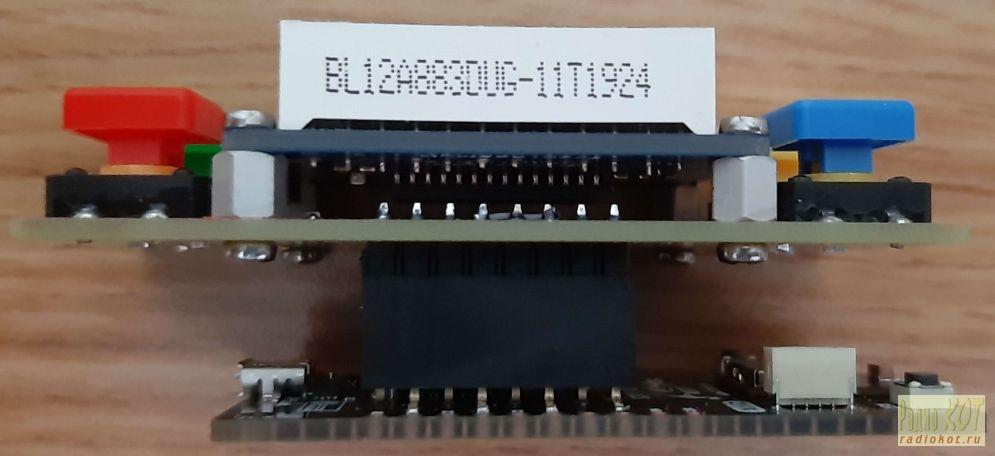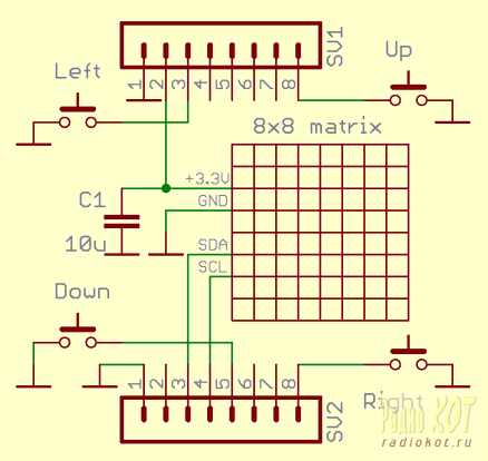 Автор: Петар Булатович и Сергей Безруков (aka Ser60) Идея проекта и программная реализация этой игры принадлежит студенту из Черногории (Петар), и была выполнена в рамках моего курса по встроенным системам весной 2021. Это был его первый проект на микроконтроллере. Игра представляет собой версию популярной в прошлом игры Frogger, реализованной на многих игровых платформах. Представленная реализация проста в плане повторения печатной платы по любой любительской технологии и доступна для начинающих. Демонстрация игры приведена на видео в конце статьи. На поле 8×8 красными точками отмечены стены и движущиеся объекты. В начале каждого уровня игры в левой части экрана помещается зелёная точка (Frog - лягушка), движение которой в четырёх направлениях можно контролировать кнопками. Каждое нажатие кнопки приводит к перемещению лягушки на одну клетку в соответствующем направлении. Целью игры является перемещение лягушки из начального положения в любую свободную клетку в самом правом столбце экрана минуя стены и так, чтобы не задеть движущиеся объекты. В игре реализовано 10 уровней, переход на следующий уровень происходит после успешного прохождения предыдущего. При столкновении с движущимся объектом текущий уровень начинается сначала. Поскольку из-за пандемии Covid-19 обучение в курсе производилось дистанционно, необходимо было предоставить каждому студенту доступ к программатору микроконтроллера и средствам разработки и отладки. Это было достигнуто применением недорогой базовой платы BGM22 Explorer Kit (BGM220-EK4314A), производимой фирмой Silicon Labs, и доступной любому студенту по цене всего 10 USD. На плате имеется J-Link программатор/отладчик и Bluetooth модуль BGM22 на основе микроконтроллера семейства EFR32 архитектуры ARM Cortex-M33. В данном проекте Bluetooth компонента модуля не задействована, и он используется просто как микроконтроллер. На базовой плате имеются 2 коннектора под стандарт и форм-фактор mikroBUS, на которые помимо питания выведены практически все выводы модуля. Это позволяет просто дополнить базовую плату внешней платой расширения, которую я собрал и отправил студенту по почте. Плата расширения устанавливается поверх базовой платы в виде сэндвича. На ней помимо четырёх кнопок управления лягушкой имеется матричный дисплей размера 1.2”, управляемый контроллером HT16K33, распаянным на её нижней стороне.