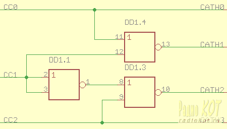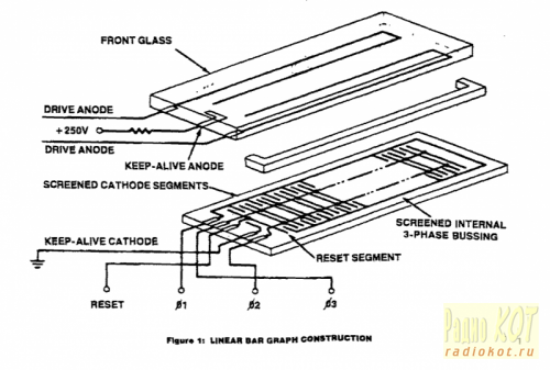 Автор: uldemir В далёкие-далёкие времена, когда еще не были придуманы светодиоды и жидкокристаллические индикаторы, одними из имевшихся в использовании были газоразрядные индикаторы разных типов. Сейчас, мне хотелось бы обратить взор на шкальные газоразрядные индикаторы. Здесь будет описано подключение и управление шкальным индикатором BG12201 (просто потому что он у меня есть), производства Burrough. Он имеет две шкалы по 201 элементу. Но, те же самые принципы, можно использовать и для подключения любых других подобных индикаторов и с меньшим числом шкал и элементов, в том числе отечественного производства, таких как ИН-33, ИН-34 и аналогичных. Газоразрядные приборы построены так, чтобы использовать особенности возникновения тлеющего разряда в газе. Главная особенность - некоторое различие между напряжением зажигания и напряжением горения. Т.е. если взять две одинаковые неоновые лампочки и подключить к источнику тока (Источник питания с резистором. Чем сопротивление резистора больше - тем ближе к идеальному источнику тока мы будем! Впрочем, это рассматривает ТОЭ) сначала одну, а затем параллельно вторую - загорится и будет гореть только одна лампочка, та, что была подключена первой. Потому как первая лампочка загоревшись, ограничит напряжение на выходе источника тока напряжением горения, которого недостаточно, для зажигания не горящей, лампочки. Ну что ж, перейдём к шкальному индикатору? На рисунке приведена схематическая конструкция шкального индикатора, который может разом отображать две шкалы. Есть индикаторы и с одной шкалой - их конструкция похожая, только на один анод у них меньше. Принцип отображения - динамический: светящийся элемент с частотой около 70 Гц пробегает от начала шкалы до заданного места, в зависимости от того, сколько элементов шкалы должно светиться. На этой картинке трудно разглядеть, поэтому приведу еще более схематичное изображение, как у этой лампы соединены катоды. Как видите, вне зависимости от числа элементов шкалы, индикатор имеет всего 4 вывода для катодов отображения. Причем, катоды могут быть расположены как в линию, так и по дуге или по кругу. Также есть индикаторы у которых катоды сгруппированы не по 3, а по 5 катодов - их принцип действия аналогичен. В начальный момент времени, при наличии напряжения на аноде, на катод сброса (обозначен буквой R или RESET) подаётся низкий потенциал, в результате чего разряд зажигается на самом нижнем - нулевом катоде. Выбора нет - между анодом и катодом сброса была самая большая разность потенциалов и, разумеется, разряд возник именно в этом месте. По прошествии некоторого времени, низкий потенциал снимается с катода сброса и подаётся на первый катод. Тут можно заметить, что к этому выводу подключен не только первый катод, но и четвёртый, седьмой итд. И тут снова, кто первый загорится - тот и будет гореть. А загорится тот, у которого условия ионизации газа будут лучше. А лучше будет у того, у кого рядом только что был газ ионизирован, т.е. в данной ситуации наивыгоднейшие условия будут именно у катода 1. Аналогично, спустя еще некоторое время, обычно 70мкс, низкий потенциал снимается с первого катода и подаётся на второй. И снова, активизируются и второй, и пятый, и восьмой, и еще куча катодов, но разряд переходит на ближайший. Так же происходит перемещение со второго на третий. Чтобы с т