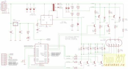 Если BT адрес для левой и правой шкалы указан одинаковый, то датчик с этим адресом будет отображаться на обоих шкалах, но значение таймаута будет использоваться от левой шкалы, а от правой - игнорироваться. Если BT адрес будет состоять из одних нулей - соответствующая шкала будут отображать "локальную" температуру. В этом случае параметр таймаута вообще не используется. После отсоединения от устройства, повторно соединиться, скажем, для проверки, будет возможно только после перезапуска устройства снова удерживая нажатой кнопку. Это сделано из соображений безопасности, чтобы никто посторонний, кто не может иметь физически доступ к устройству, не мог изменить его настройки или залить другую прошивку. Сохранённые настройки, также, будут в силе только после перезапуска. Если при записи строка будет короче, то изменятся только переданные байты - остальные останутся неизменными. Если строка будет длиннее 10 байт - вы сами будете виноваты, если что-то пойдёт не так. Программа, записываемая в микроконтроллер, составлена в среде Simplicity Studio v5 и доступна в виде исходника. В свежеприобретённый модуль необходимо загрузить бутлоадер bootloader-storage-internal-single-352k.hex и саму программу bargraph_thermo.hex. Если есть проблема с програмированием этих модулей (для программирования необходим Segger J-Link), то эту конструкцию можно выполнить используя Explorer Kit BRD4314A, который содержит на одной плате и модуль, и программатор (с отладчиком) и два ряда контактов под стандартный разъём с шагом 2.54 мм. Правда, проект нужно будет пересобрать указав в качестве целевого микроконтроллера BGM220PC22HNA (отличаются типом генератора на 32кГц и объёмом памяти) и создать, скомпилировать и загрузить соответствующий бутлоадер. В схеме можно применять и другие компоненты помимо указанных на схеме. Диоды VD1 и VD2 должны быть типа ultra fast с временем восстановления не хуже 70нс и VD1 выдерживающий обратное напряжение не ниже 400в, а VD2 может быть попроще - 150в. Диоды VD3-VD8 могут быть обычные выпрямительные или маломощные диоды, выдерживающие обратное напряжение 200в для VD7-VD8 и 100в остальные. Трансформатор намотан на магнитопроводе EFD20. Сердечник из материала N87 с зазором 0.25мм. Первичная обмотка состоит из 17 витков в 3 провода диаметром 0.25мм, вторичная из 214 витков проводом 0.12мм с отводом от 63 витка. Микросхема LM2577 должна быть с индексом -ADJ, но возможно применение и с другими индексами, указывающими напряжение стабилизации этой микросхемы. В этом случае, резистор R5 не устанавливается, а номиналы резисторов R3-R4 должны быть пересчитаны, чтобы соответствовать примененной микросхеме. В схеме можно пробовать применить и другой источник высокого напряжения. Если примененный источник не имеет возможности генерировать напряжения смещения, то напряжение смещения 72в можно брать с резистивного делителя образованного R10-R11 и одного из резисторов R12-R13,R16,R18 (в каждый момент времени подключен один из них). Но в этом случае диоды VD3-VD6 и транзисторы VT1-VT4 должны быть расчитаны на обратное напряжение не ниже 300в. Потому как при запуске, если высокое напряжение появится раньше, чем микроконтоллер откроет один из катодных ключей,на этом "делителе" могут быть все 250в. Но этот вариант не проверялся - пробуйте на свой страх и риск. В случае если используется приведенная схема, то резисторы R10-R11 не устанавливаются. Так же, в схеме можно применить 
