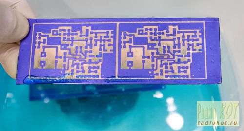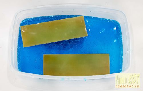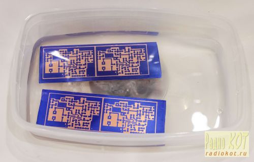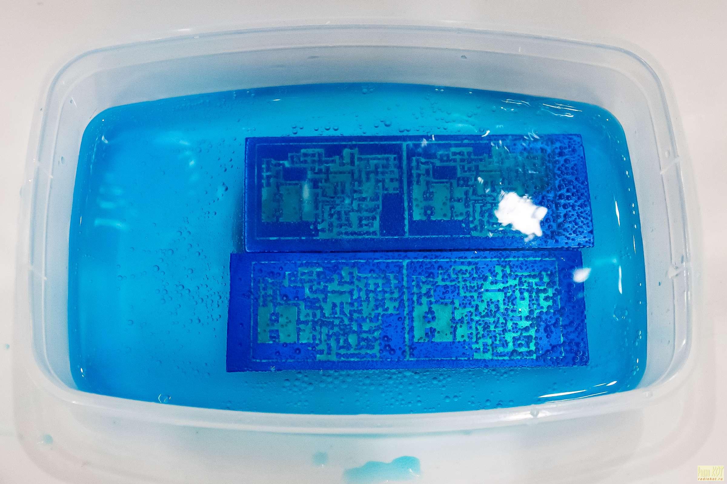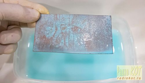 Данного раствора хватает для стравливания 100 см2 меди толщиной 35 микрон. Первоначально описание данного состава мне попалось тут на сайте в статье Безопасный общедоступный состав для травления меди в домашних условиях [3]. В общем-то в приготовлении и использовании данного раствора нет ничего сложного, но есть некоторые особенности и подводные камни, о которых мы поговорим позже. Итак, после того как Вы приготовили травильный раствор в простейшем случае необходимо просто погрузить в него ранее подготовленную заготовку с нанесенным защитным рисунком и покачивая ёмкость (этим обеспечивается циркуляция травильного раствора) дождаться стравливания меди с незащищённых участков. Процесс протекания травления показан в подборке фото ниже. При этом при травлении в правильно приготовленном растворе в тонком слое цвет раствора должен быть бирюзовый. После окончания травления необходимо тщательно промыть заготовку большим количеством воды. На этом процесс травления можно считать оконченным.
