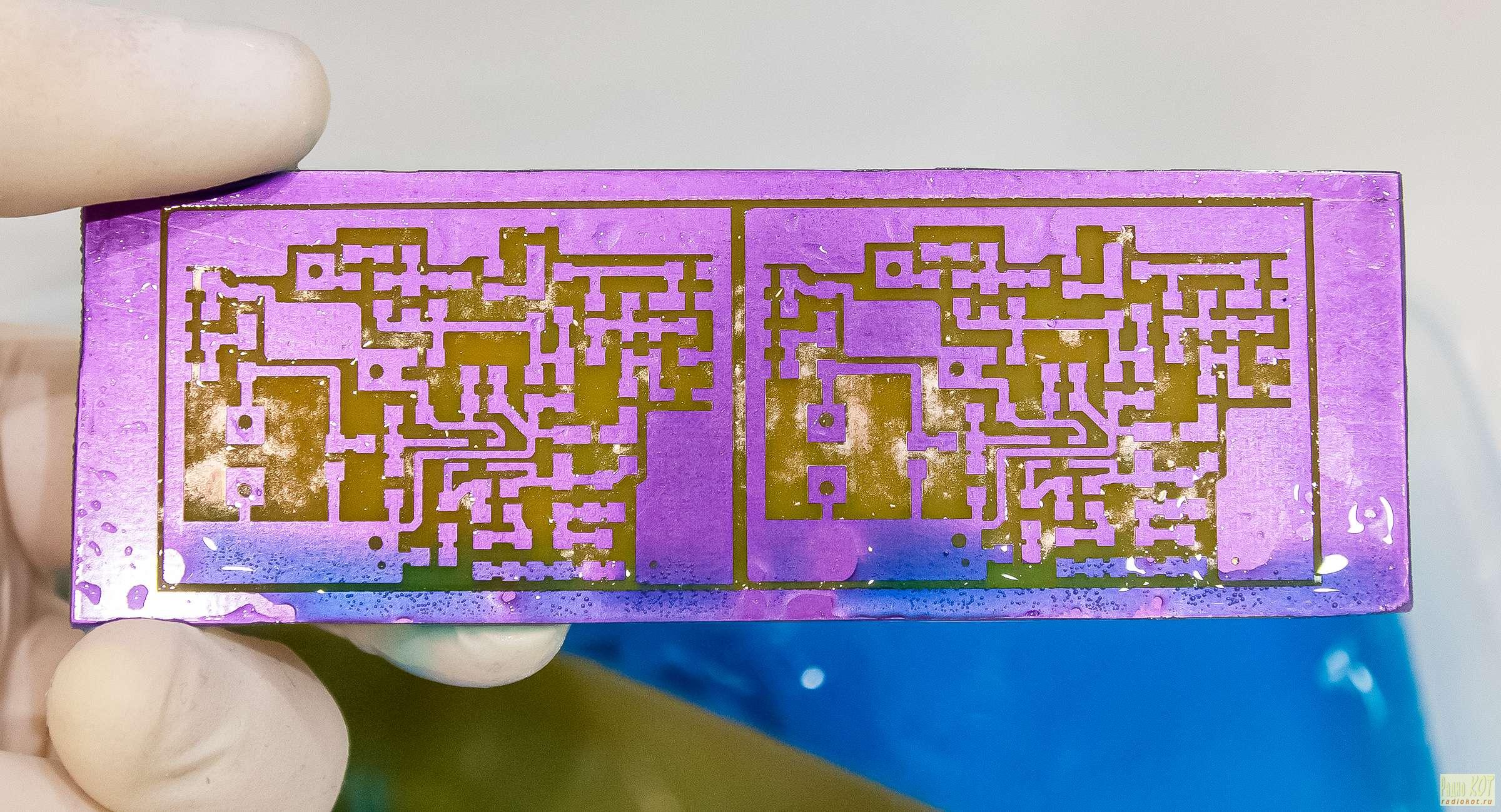 В демонстрационном опыте использован 10% раствор перекиси водорода — для большей наглядности увеличения скорости протекающих реакций, но в определённых условиях процесс так же развивается и при использовании всего 3% раствора. На данном этапе необходимо вспомнить о том, что химические реакции протекают на поверхности реагирующих веществ. Таким образом, чем больше площадь одновременно стравливаемой поверхности — тем выше вероятность подобного развития событий. Но на площадь будущих печатных плат на момент травления мы уже никак повлиять не можем — значит должен быть другой способ вернуть процесс в нормальное русло… И он есть — для предотвращения подобного развития событий необходимо понизить температуру раствора и/или снизить концентрацию реагирующих веществ. Наиболее просто оба этих условия можно выполнить, если прилить к раствору холодной воды. При этом скорости всех протекающих реакций значительно упадут (чем больше прильете воды — тем сильнее упадут). Другим способом превентивного решения данной проблемы является использование принудительного охлаждения травильного раствора (например, омывание ёмкости холодной водой), а так же использование менее концентрированных растворов перекиси водорода (например, 1-1.5%. Особенно для заготовок с большой стравливаемой площадью). Нормально протекающий процесс должен выглядеть вот так: На видео слева показан процесс травления в самом его начале, а на видео справа — практически в самом конце. При этом на правом видео отчётливо видны относительно крупные пузыри. На такое протекание процесса уже необходимо обратить внимание. Температура раствора в этот момент была около 40 градусов Цельсия. Кстати, всплывание заготовок из-за газовыделения связано с тем, что заготовки выполнены на двухстороннем стеклотекстолите — вторая сторона стравливалась полностью т.к. была повреждена и не непригодна для изготовления двухсторонних печатных плат. Что бы не надевать СИЗы два раза параллельно заснял ещё один опыт, показывающий, почему не стоит использовать при подготовке поверхности раствор перекиси водорода в высокой концентрации (об этом мы говорили в части статьи, посвящённой подготовке поверхности). По видео отлично видно образование плёнки оксидов при извлечении платы из травильного раствора. В данном демонстрационном опыте для большей наглядности использован травильный раствор в той же концентрации, что и выше. Во-вторых, небольшой нюанс, про который обычно многие забывают — необходимая концентрация лимонной кислоты в растворе. В исходной статье указано, что не стоит жалеть лимонную кислоту т.к. при её недостатке на поверхности может выпадать малорастворимый средний цитрат меди. И это так… Несмотря на то, что количество лимонной кислоты в исходном составе взято с хорошим запасом для плат с большой стравливаемой площадью всё же лучше использовать более концентрированный раствор. На мой взгляд оптимальным является использование 40 грамм лимонной кислоты на тот же объём раствора и ту же площадь стравливаемой поверхности. В-третьих, достаточно частый вопрос: а что будет, если хлорида натрия насыпать на глазок (скажем грамм 20 вместо 5)? Да в общем-то ничего страшного не произойдёт — скорость травления увеличится по ощущениям раза в 2-3 (в зависимости от избытка поваренной соли) с