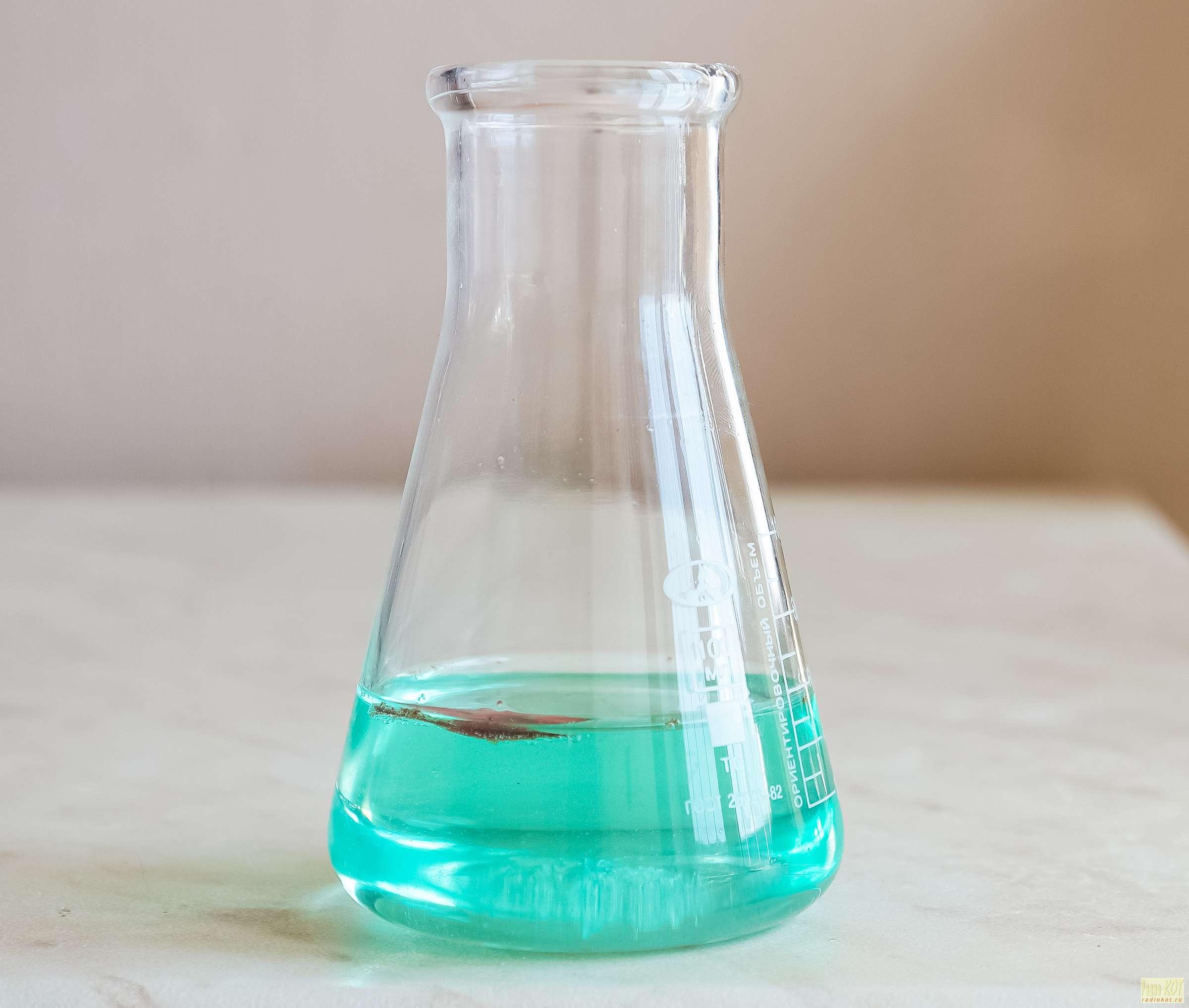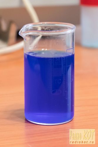 Я думаю давать какие-то комментарии насчет необходимой растворимости солей меди в процессе травления излишне т.к. по фото и видео всё и так отлично видно. Но тем не менее мной было окончено стравливание слоя меди с подогревом раствора в целях получения чистого оксалата меди для проведения пары завершающих экспериментов. В первой части данной статьи, посвященной подготовке поверхности, я говорил о том, что отличительным свойством Трилона Б является возможность переводить многие нерастворимые соли металлов в растворимые. Оксалат меди для демонстрации данного процесса подходит отлично! Для опыта необходимо насыпать небольшое количество оксалата меди (2-3 грамма) в колбу, прилить 70-100 мл дистиллированной воды и перемешать. Будет хорошо видно, что оксалат меди в воде не растворим, находится в виде взвеси и быстро выпадает в осадок. Если после этого к раствору присыпать 5-10 грамм Трилона Б, то практически сразу можно заметить, что раствор стал изменять цвет с кислотно-голубого на тёмно-синий. При тщательном перемешивании уже через несколько минут будет отчётливо видно, что нерастворимого осадка оксалата меди стало значительно меньше, а раствор стал более прозрачным. На видео ниже наглядно показан данный эксперимент. Второй же эксперимент не касается непосредственно процесса изготовления печатных плат. Практически в начале данной статьи я говорил, что реакция взаимодействия ионов меди и раствора гидроксида аммония с образованием аммиаката меди является достаточно чувствительной. Данную реакцию можно использовать для обнаружения ионов меди в растворе. Для проведения эксперимента необходимо взять небольшое количество оксалата меди (см. подборку фото ниже), добавить 70-100 мл. дистиллированной воды и прилить 5 мл. 10% раствора гидроксида аммония. Раствор окрасится в сине-фиолетовый цвет (см. цвет раствора в колбе). В подборке фото ниже наглядно представлен данный эксперимент. Несмотря на то, что было взято небольшое количество оксалата меди — оттенок раствора чётко видно невооружённым глазом. При использовании фотометрических методов с необходимыми светофильтрами в лабораторных условиях можно определять значительно меньшие количества ионов меди в растворе, но для демонстрации процесса этого достаточно. Для полноценной демонстрации цвета аммиаката меди присыплем избыток оксалата меди к раствору, тщательно перемешаем и подождём 5-10 минут образования комплекса аммиаката меди и оседания излишков оксалата меди. После этого отфильтруем раствор. В фильтрованном растворе отлично виден сине-фиолетовый цвет аммиаката меди (см. фото цвета в хим. стакане)