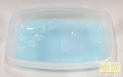 Интересные моменты начнутся уже на этапе приготовления раствора — при растворении в теплой воде щавелевой кислоты раствор будет достаточно быстро остывать т.к. энтальпия растворения щавелевой кислоты минус 9.5 кДж/моль (т.е. процесс эндотермический). Даже если Вы возьмёте воду с температурой 40-60 градусов Цельсия, то после растворения 10 гр. щавелевой кислоты раствор будет практически комнатной температуры. Сам процесс травления при комнатной температуре протекает достаточно медленно и требуется постоянный подогрев раствора. При этом подогревать раствор выше 35-40 градусов не рекомендуется т.к. начнётся распад перекиси водорода. В данном травильном растворе самопроизвольное закипание раствора, скорее всего, маловероятно, но перекись будет использована напрасно. При падении температуры раствора ниже комнатной из раствора начнут выпадать кристаллы щавелевой кислоты т.к. у неё достаточно низкая растворимость — 10 гр./100 мл. при 20 градусах Цельсия. Кроме того на поверхности печатной платы даже при обильном перемешивании будет оседать ощутимый слой нерастворимого оксалата меди кислотно-голубого цвета, что затруднит доступ травильного раствора к поверхности заготовки. В итоге заготовка, если удалить слой оксалата меди жёсткой щёткой, будет иметь достаточно высокую шершавость. На видео ниже показан процесс травления с использованием щавелевой кислоты при температуре раствора около 30 градусов Цельсия. На фото описанные процессы выглядят вот так: