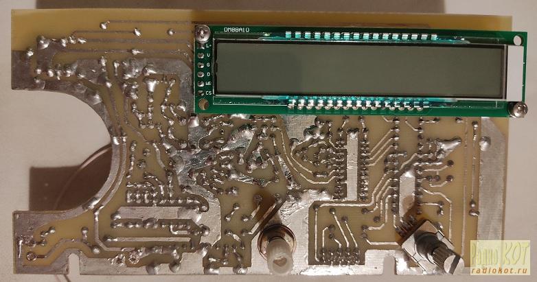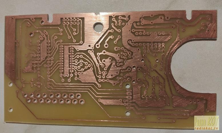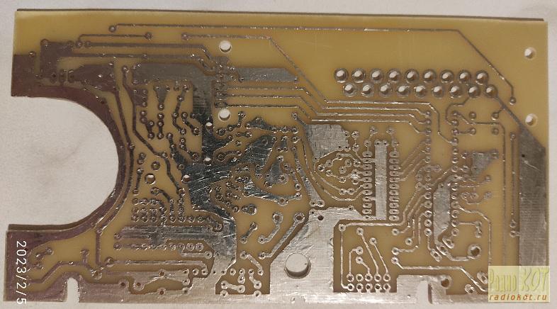 С выходного трансформатора FrontEnd сигнал ПЧ усиливается двухкаскадным предварительным УПЧ на транзисторах S9018. Необходимая избирательность обеспечивается керамическими фильтрами SFE10,7. Далее сигнал ПЧ усиливается микросхемой LA1260 - УПЧ и детектор. Эта микросхема также имеет простую схему включения. Для детектирования используется контур, а не дискриминатор. Это позволяет получить минимум искажений. Трансформатор ПЧ и дискриминатор можно использовать от китайского радиоприемника или приобрести на Aliexpress. Контура бывают с размерами 10х10мм и 7х7мм. Наш 10х10мм. Сигнал НЧ усиливается микросхемой УНЧ – TA7368. Эта микросхема позволяет при питающем напряжении 9В получить выходную мощность до 1 Вт на нагрузке 8В. Мне эта микросхема УНЧ нравится тем, что позволяет регулировать коэффициент усиления внешним резистором. Нагрузкой УНЧ является динамическая головка 0,5ГД-37 сопротивлением 8Ом. Этот динамик очень приятно звучит в отличии от большинства китайских аналогов в аналогичных приемниках. Конечно басов от него не получить, но этого и не требуется. В качестве синтезатора используется микросхема LC72131. Управление синтезатором довольно простое, если немного вникнуть. О нем в интернете много информации, все подробно описано. Главное опасение было насчет ФАПЧ, ее устойчивости. С используемыми в схеме элементами ФНЧ проблем с устойчивостью не возникло. Было изготовлено три радиоприемника с небольшими схемотехническими изменениями, но все они работали хорошо. В качестве управляющего микроконтроллера используется распространенный микроконтроллер ATmega8. Для переключателя, кнопки, энкодера используются встроенные в микроконтроллер подтягивающие резисторы. В качестве дисплея используется 10 разрядный 16 сегментный буквенно-цифровой ЖК дисплей с подсветкой и управлением по SPI. Его размеры идеально подходят для размещения вместо шкалы. Для управления дисплеем была написана библиотека. Проект разработан в среде CodeVisionAVR. В приемнике есть схема контроля питания. При снижении напряжения батареи до 5,5В приемник выключается – контроллер и ЖК дисплей уходят в сон, при этом аналоговая часть работает, но не управляется, это указывает на то, что батарея разрядилась. Печатная плата для радиоприемника разработана в программе Sprint-Layout 5.1 и изготовлена с помощью ЛУТ. Луженная: