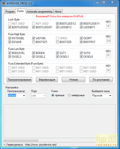 Программирование микроконтроллера осуществляется с помощью программы Avrdudeprog 3.3. FUSE биты для программирования: