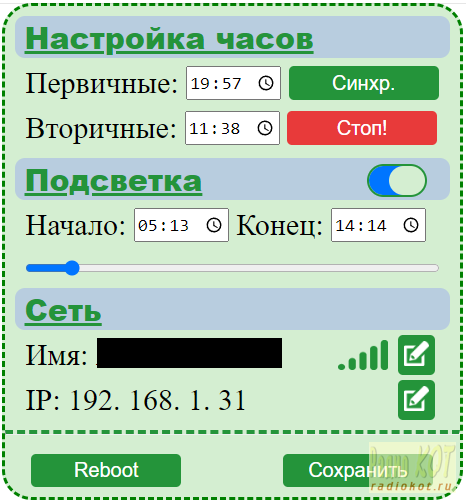 Настройка через WEB интерфейс. Настройку постарался сделать интуитивно понятной. Блок "Настройка часов": Отображает время первичных и вторичных часов в реальном времени. Для настройки первичных часов нужно нажать на кнопку "Синхр.". На устройство отправится время, взятое из браузера вашего мобильного устройства. Для настройки вторичных часов необходимо их сперва остановить нажав на кнопку "Стоп!". Затем установить время в блоке часов и нажать кнопку "Сохранить". (При успешном выполнении действий будет появляться слово "ОК"). А затем запустить часы кнопкой "Пуск" (Появится вместо кнопки"Стоп"). Блок "Подсветка": В блоке настраивается интервал работы подсветки и её яркость. А также есть кнопка выключить/включить подсветку полностью. Блок "Сеть": Здесь отображается "Имя" сети к которой подключается устройство, сила сигнала сети и кнопка с символом "Изменить". При нажатии на эту кнопку откроется дополнительное окно. В этом окне можно просканировать пространство и выбрать доступную сеть, к которой хотите подключиться и указать пароль. Не забывайте, что нужно нажимать на кнопку "Сохранить». Кроме того в блоке "Сеть" можно задать IP адрес устройства нажатием на кнопку с символом "Изменить". ГЛАВНОЕ! IP адрес задается статический! Поддержки DHCP нет! Кнопка "Reboot" перезагрузит устройство. Вот и весь проект. Берите, пользуйтесь, модернизируйте! Ведь в совершенстве нет придела! Всем спасибо что дочитали. Всем пока!