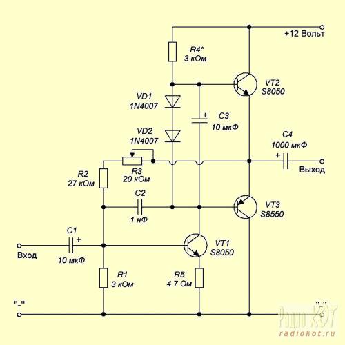 Резистор R5 – резистор отрицательной обратной связи. Основное её назначение – повышение линейности работы каскада предварительного усиления, а также температурная стабилизация. Температурная стабилизация работает следующим образом: при повышении температуры увеличивается ток коллектора транзистора VT1, соответственно увеличивается и ток эмиттера, а вместе с ним и падение напряжения на резисторе R5 (согласно закону Ома). Увеличение падения напряжения приводит к уменьшению напряжения между базой и эмиттером транзистора VT1. Это в свою очередь приводит к уменьшению тока базы и следовательно тока коллектора. Таким образом влияние температуры частично нивелируется. При уменьшении же температуры уменьшается ток коллектора, уменьшается ток эмиттера, уменьшается падение напряжения на резисторе R5, увеличивается напряжение между базой и эмиттером транзистора VT1, увеличивается ток базы, увеличивается ток коллектора.