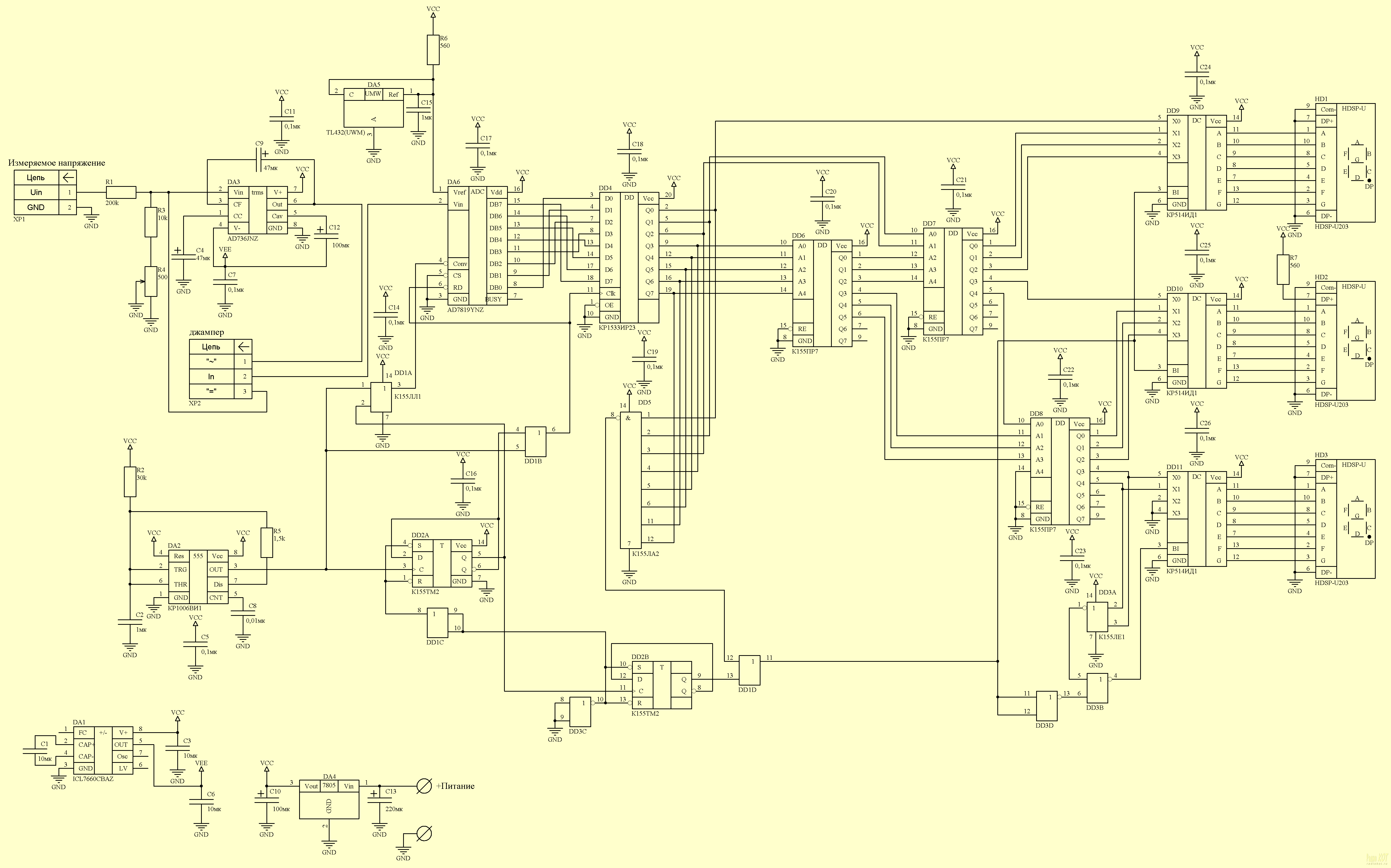 Автор: ejsanyo Приветствую любителей аппаратной логики! А давайте сегодня сделаем...вольтметр? Вот на чём нормальные люди обычно делают вольтметры? Нормальные люди "велосипеды" не изобретают. Как правило, берётся либо специализированный чип, вроде ICL7107 или его многочисленных клонов, включается по типовой схеме, и, в общем-то, всё, готов измеритель на 3,5 разряда. Те, кому этого недостаточно, берут микроконтроллер и измеряют его встроенным АЦП. Кому и этого недостаточно (например, требуется выше точность или гальваническая развязка измерительной части) берут и вешают на контроллер внешний АЦП, коих на сегодняшний день существует великое множество. А сможем ли мы заставить какой-нибудь из этих АЦП работать без контроллера? Что-ж, попробуем. Достался мне тут чип под названием AD7819. Это неплохой для своего времени, функционально законченный униполярный восьмибитный АЦП с очень простым параллельным интерфейсом. Как следует из документации, цикл преобразования делается в три этапа: