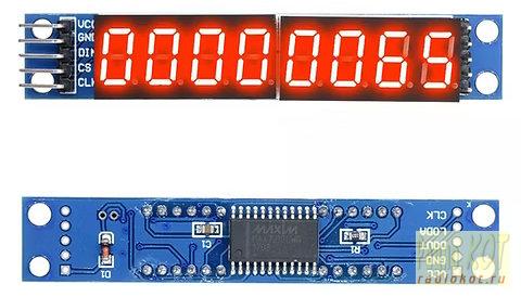 Из недостатков, как мне кажется, можно назвать отсутствие возможности чтения содержимого регистров, отсутствие возможности дополнительно подключить кнопочную клавиатуру и опрашивать её (во многих других подобных чипах такие вещи есть). Ещё в наше время, пожалуй, отсутствие возможности работать с питанием 3,3В тоже сойдёт за минус. Ну и как следовало ожидать, рынок наводнён массой готовых модулей с участием MAX7219, на любой вкус и цвет. Есть изделия с "восьмёрочными" индикаторами, есть с точечными, причём каскадное соединение в них, как правило, предусмотрено изначально.
