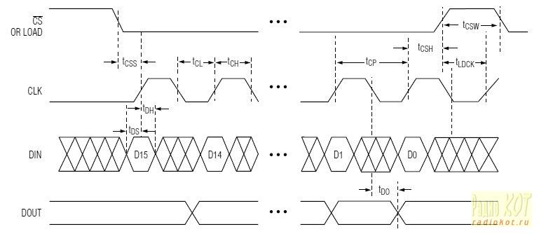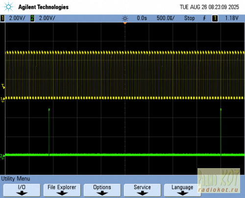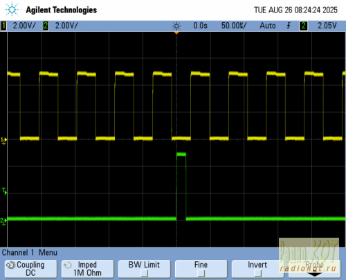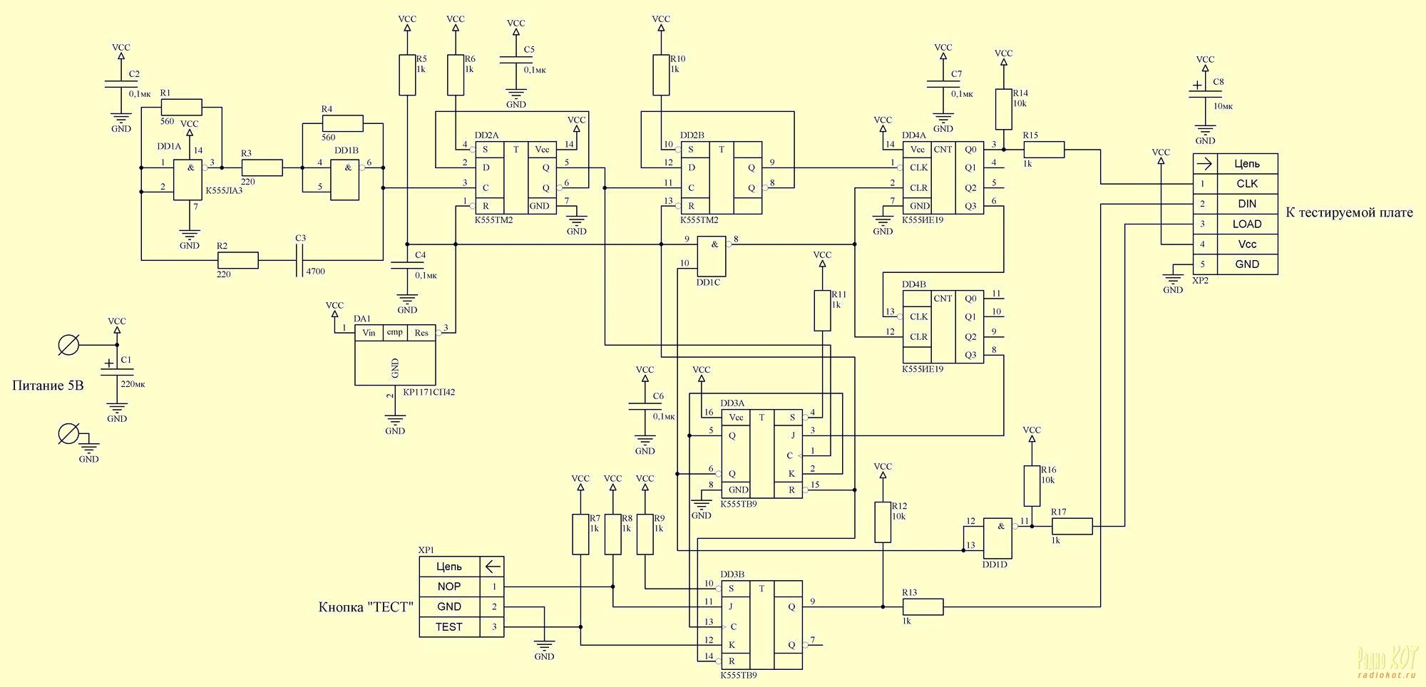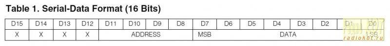 И вот, допустим, купили вы такой модуль на условном Алиэкспрессе, или сделали свою плату самостоятельно. Как проверить, что всё более-менее работает? По крайней мере, что горят все светодиоды? И с этим есть нюанс: если вы просто подадите питание на плату, ничего не произойдёт. По умолчанию, без инициализации, MAX7219 остаётся в выключенном состоянии и никакой индикации выдавать не хочет. Явно нужен микроконтроллер, чтобы разбудить его...или всё же можно обойтись без него? Попробуем разобраться. Для чего снова обратимся к даташиту. К списку регистров чипа. И видим в нём весьма интересный регистр под названием "Display test". Да, это как раз специально заложено для тестирования сборки на исправность. Если сделать запись в него, то чип зажигает все светодиоды с максимальной яркостью. Вот бы нам сделать правильную запись в этот регистр. Видно, что последовательные данные вкачиваются в интерфейс по переднему фронту импульсов CLK, начиная со старшего бита. Всего слово данных составляет 16 бит. По переднему фронту сигнала LOAD данные, которые к тому времени успели влезть во входной буфер интерфейса, перебрасываются во внутреннюю логику чипа и выполняются им. Кстати про буфер: он представляет собой сдвиговый регистр (или FIFO, если хотите). Если до момента прихода импульса LOAD мы попытаемся залить в него более 16 бит, то лишние биты начнут вылезать с противоположной стороны через выход DOUT. Именно это используется для каскадного включения: просто закачиваем последовательно столько 16-битных слов, сколько чипов висит в цепочке, и общим сигналом LOAD одновременно отправляем код на выполнение. Теперь посмотрим, как нам через всё это добраться до регистра Test: Любопытное дело: из 16 бит пакета используется, по сути, только 12! 4 бита на адрес регистра, да 8 бит для данных, которые мы хотим залить в регистр. А старшие биты могут быть какими угодно, они не на что не влияют. А если почитать повнимательнее про содержимое регистра Test: Ну надо же, как много "иксов"! Т.е. битов, которые вообще ни для чего не используются. И лишь самый последний бит определяет, будет ли включен тестовый режим. А если ещё учесть, что адрес нашего регистра ни что иное, как F, т.е. все единицы, это недвусмысленно намекает на способ изрядно всё упростить: необязательно как-то осмысленно формировать поток данных, достаточно просто повесить линию данных на Vcc! Ещё раз подчеркнём, что таким способом мы можем, к сожалению, только включить режим "Тест". Чтобы выключить его, а также сделать ещё что-либо, придётся формировать адекватные данные. Кстати, а что будет, если линию данных повесить на землю и закачать всё это в чип? Если аналогично проанализировать то мы получим запись нуля в регистр "No-op", который делает...ничего! И не важно, что конкретно при этом мы в него записываем. Это имеет смысл для ситуации каскадного включения чипов, когда мы хотим что-то изменить, скажем, в последнем чипе цепочки, не затрагивая регистры предыдущих. Вот так получается, что по минимуму нам остаётся всего лишь сформировать тактовые импульсы, да вставить через нужное их количество импульс LOAD. Данное количество в минимальном варианте составляет 16, но мы же помним про возможность соединять чипы "паровозиком"? Так что сделаем, пожалуй, 64 импульса, чтобы прокачать командами Test хотя бы 4 объединённых индикатора, вряд ли на практике потребуется бол