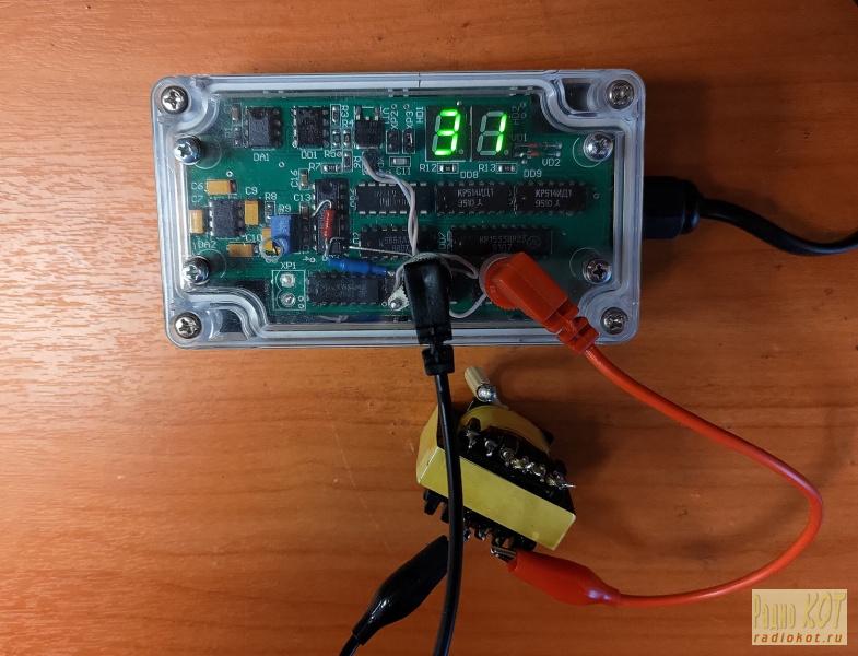 Для обеспечения работоспособности компаратора в области низких входных напряжений требуется не только питание 5В для цифровой части, но и двухполярное для аналоговой. Эту проблему решает DA2 MAX680, который представляет собой, условно говоря, конденсаторный преобразователь напряжения, который разработчики выдрали из своего же популярного драйвера MAX232. Он, можно сказать, создан для питания К554СА4, поскольку выдаёт практически номинальные для этого компаратора ±9В с подходящим током нагрузки. Единственный его недостаток, это, пожалуй, цена, за которую его продают в наше время. Дальше всё относительно просто: DD4, DD5 это два последовательно включенных двоично-десятичных счётчика, которые подсчитывают импульсы. Два десятичных разряда на практике вполне достаточно для подсчёта импульсов даже самого "звонкого" контура. Для обеспечения быстродействия специально взяты чипы из серии 74ALS КР1533. Счётчики сбрасываются по входам R0 после размыкания ключа, одновременно с этим подсчитанное число импульсов переносится в запоминающий регистр DD7. Текущее содержимое регистра визуально отображают классические драйверы-дешифраторы DD8, DD9. Их выходного тока в несколько мА как раз нормально хватает для зажигания современных светодиодных "восьмёрок" с общим катодом. HD1 показывает десятки "рингов", HD2 - единицы. Но не будем останавливаться на достигнутом и добавим некоторые шашечки дополнительные функции. Как насчёт сделать индикацию того, что катушка не подключена к схеме (контур разорван)? Это сразу поможет выявить внутренний обрыв или, скажем, проблемы со щупами. Для этой цели служит R6. Его номинал подобран с учётом входного сопротивления компаратора таким образом, чтобы при отсутствии катушки гарантировать срабатывание компаратора при любом выставленном пороговом уровне. Если катушка подключена, она, разумеется, своим низким сопротивлением сольёт смещение от R6 практически в ноль. Как это всё нам поможет обнаружить обрыв? Смотрите дальше: триггер DD3:1 запоминает состояние выхода компаратора, которое он принимает в самый начальный момент после замыкания ключа. Т.е., если катушка целая, колебания в этот момент только начинают процесс раскачивания, и на выходе компаратора должен быть ноль. Если там единица, значит, отрабатывает смещение через R6, а с целостностью контура есть проблемы. Как же показать наличие проблем, если они есть? Для этого единица, если её запомнил DD3:1, активирует входы R9 счётчиков - это принудительная установка их в состояние "все девятки". А заодно, через элемент DD2:3 в обоих индикаторах зажигаются точки. Вернее даже так: если неисправность есть, на выходе DD2:3 единица, которая не мешает гореть точкам, получая питание через R12, R13. Если всё хорошо, на выходе DD2:3 ноль, который гасит точки. Падение напряжения на открытых диодах VD1, VD2 ниже, чем на светодиодах точек, потому те и не горят. Таким образом, индикация обрыва выглядит как "9.9." Чего бы ещё добавить, может, индикацию переполнения счётчиков? Чтобы видеть ситуацию, когда счётчик, досчитав до "99", следующим импульсом сбросился в ноль и пошёл считать по второму кругу. Скажете, зачем это нужно? Разумеется, чтобы обнаруживать некоторые проблемы с самим "ринг-тестером"! В частности, мне это помогло вовремя заметить проблемы с ложными импульсами компаратора. Для реализации этой фичи стоит триггер DD3: