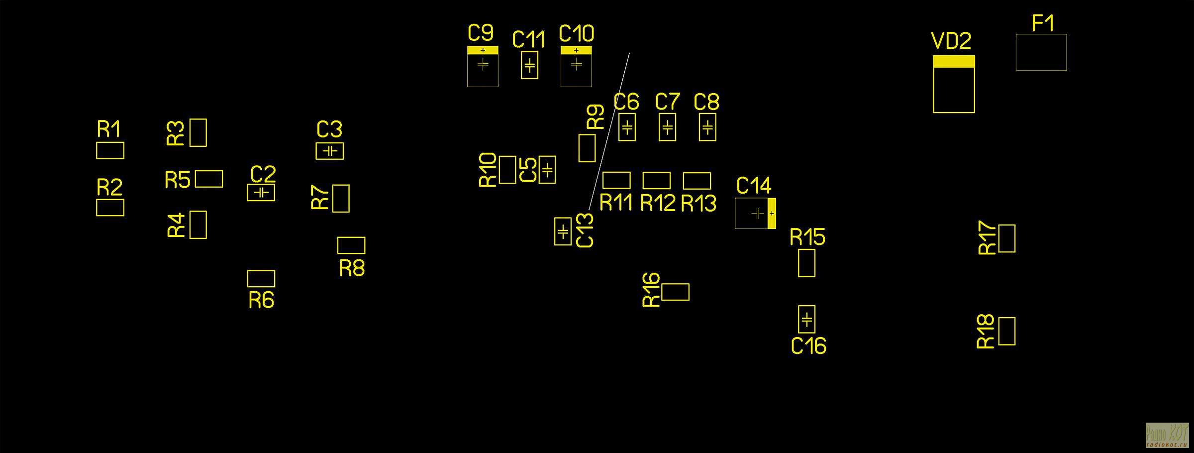 Тут следует отметить, что выводные компоненты устанавливаются с обратной стороны от проводящего рисунка, а компоненты для поверхностного монтажа – со стороны проводящего рисунка. При этом сборочный чертеж выполнен так, если бы мы смотрели на печатный узел как раз со стороны проводящего рисунка. Это необходимо учитывать при установке микросхем, диодов, а также полярных конденсаторов.
