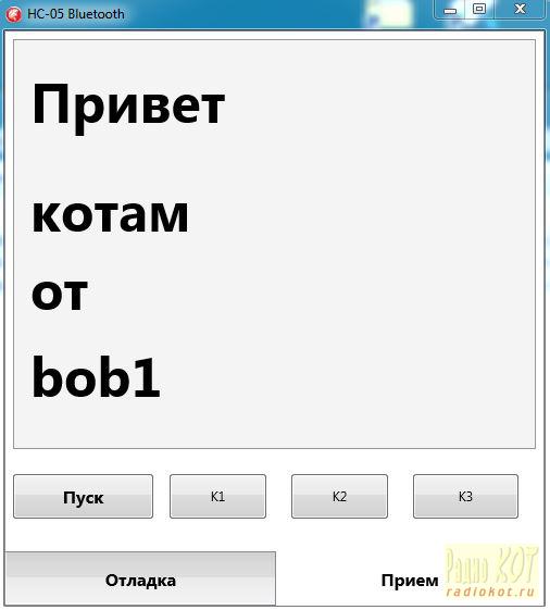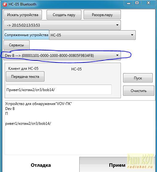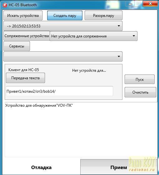 рис.1 3. Жмем кнопку "Создать пару". В панели задач выйдет окно требующее участия пользователя. Нажимаем. 4. В окне вводим пароль подключения. Обычно это 1234 или 0000. 5. После создания пары, для проверки нажимаем кнопку "Сопряженные устройства". В выпадающем меню выбираем НС-05. 6. Нажимаем кнопку "Сервисы". Должны выйти цифры сервиса нужного нам сервиса для передачи данных (в синем кружочке). 7. Соединяем выводы RX и ТХ. Это для проверки модуля...создания эхо. 8. Нажимаем 2 раза кнопку "Передача текста" . В нижнем части окна (рис.1) появится П.... ривет1/котам2/от3/bob14/ , а во вкладке "Прием" как на рис.2. рис.2 9. Отсоединяем выводы RX и ТХ. Подключаем их к вашему устройству. з.ы. вышеуказанные пункты проходятся только один раз. Каждый раз проходить не надо!!! з.ы.2 Hc-05 модуль в состоянии поставки. Настройки его не менялись. Режим Slave, имя HC-05.