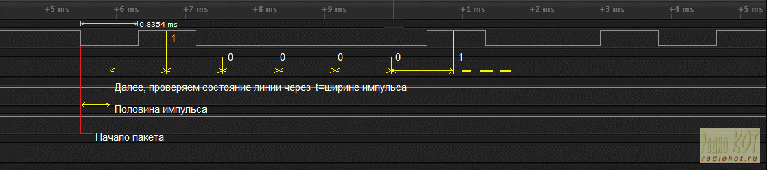 Вот я и решил, что тактовый интервал равен 0,8354ms, и надо считывать значение бита через такой промежуток, пока не будет принят весь пакет из 118 бит.