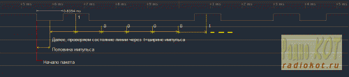 от первого перепада на линии из 1 в 0 сделать паузу на половину ширины импульса, считать значение, и далее - через паузу ширины импульса чиать остальное