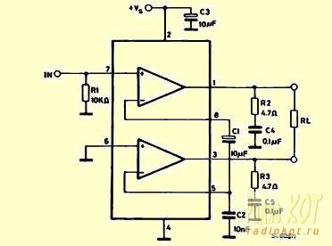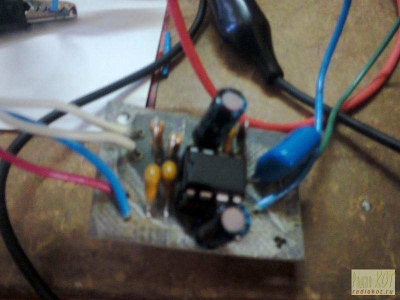 Автор: ASV Решил собрать себе портативную колонку, которую можно было бы носить с собой и подключать к mp3 плейеру. Остановился на микросхеме tda2822m, из за её низкой стоимости (15 рублей) и возможности работать в стерео режиме на 2 динамика и на один в режиме мост. Последний режим нас и интересует, так как там на выходе мощность будет выше. Питание я собираюсь сделать от 2 Li-ion аккумуляторов на 3.7 В. от сотовых, в статье об этом усилителе писалось, что 2 Li-ion аккумулятора способны питать усилитель целый день при удовлетворительной громкости. Ниже привожу схему по которой собирал, взятую из даташита. Микросхему я посадил на панельку, конденсатор на входе (на схеме не изображен, на печатке стоит под углом 45 градусов) я взял пленочный, все остальные конденсаторы керамика “желтые капельки”. Все резисторы на схеме мощностью 0.25 Вт. Электролитический конденсатор С3 по питанию можно в принципе поставить и большей емкости, но в нашем случае при питании от аккумуляторов, в этом большой необходимости думаю нет. Также его можно зашунтировать керамическим конденсатором 0.1 МкФ. При необходимости можно сделать у колонки свой регулятор громкости, тогда R1 нужно убрать, взять переменный резистор на 10 кОм, подключив заместо R1 крайние выводы переменного резистора, а со среднего вывода подавать сигнал на 7 вывод микросхемы. Динамик я взял на 5 Вт., запитывал для проверки от регулируемого блока питания выставив на нем 7.4 В., звук не хрипел, играло чисто. Для подачи сигнала от mp3 плейера рекомендую воспользоваться кабелем от наушников или подобным с штекером Джек 3.5, один проводок нужно соединить с пленочным конденсатором, второй пустить на землю, третий если взяли стерео Джек не используется. Печатная плата также взята мной с даташита и перерисована в Sprint-Layout. Рисунок печатной платы ниже : После того как спаял, решил сделать несколько фото, качество не очень, сорри, было поздно и освещение было не очень, Со стороны деталей: Со стороны дорожек, еще не отмыто спиртом: Список деталей: tda2822m Панелька 8 ног, под tda2822m. С1=10мкф*10в С2=10нф=0.01 мкФ. С3=10мкф*10в С4=0.1 мкф С5=0.1 мкф R1=10 кОм 0.25 вт R2=4.7 Ом 0.25 вт R3=4.7 Ом 0.25 вт