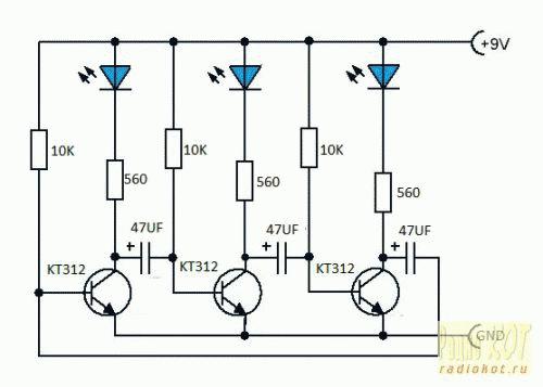 Привет дорогой радиолюбитель.Если ты не знаешь чегоб такого спаять,то на сей раз я могу предложить ТРЕХФАЗНЫЙ МУЛЬТИВИБРАТОР!Что не слыхал про такой?Это простое а главное,интересное устройство переключает по очереди аж ТРИ светодиода!