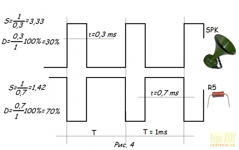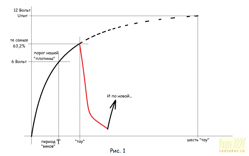Автор: Игорь Парунин, egor-palunin@rambler.ru Статья посвящается начинающим Радиокотам, В сети большое количество сирен. Авторы не щадят таймеров, логики, спец микросхем и даже микроконтроллеров. В ход идут мощные пезо-излучатели и импульсные трансформаторы, и это правильно! Только вот что делать, если их нет, или не хватает уверенности в своих силах? На самом деле, громкую сирену, с красивым плавным тональным переходом, можно собрать на "рассыпухе". Которую можно выковырять из отслуживших свой срок телеков, видиков или еще чего. Для схемы сирены не понадобится ни одной современной или специализированной микросхемы, а только самые распространенные транзисторы. И звук этой сиренки, будет ничуть не хуже звука новенькой китайской, а может даже и лучше - все зависит от вас. Итак, схема. Схема содержит два генератора. Первый для генерации тона, второй для изменения тона, или как говорят спецы - модулирования. Один из них наверняка вы узнали, это мультивибратор (VT3, VT4, VT5). Правда… он не совсем обычный, он не симметричный, и одно плечо содержит целых два транзистора. Не пугайтесь все верно, это так называемый, в посвященных кругах, транзистор Дарлингтона - составной транзистор для усиления тока. А усиливать ток надо, чтобы было громко. Этот генератор как раз и ответственен за тон. А вот что же это за абракадабра из транзисторов VT1, VT2? Это тоже генератор, и называется он – релаксационный. Генерирует он хитрое напряжение в форме «пилы». Нужно оно, для управления тоном главного задающего генератора. Что ж это за странная схема такая - спросите вы - транзисторы соединены как будто наугад! Подозрения ваши напрасны, это аналог однопереходного транзистора, легендарного КТ117А, выпускавшегося в СССР. Который я уверен не раз побывал в околоземном космическом пространстве, а может быть даже и дальше. Но это, как вы сами понимаете – секретно. ![]() Стоит так же отметить, почему порог выбран именно 6 Вольт, а не три или восемь, к примеру. Связано это с величиной под названием постоянная времени RC цепи τ (тау), которая измеряется в секундах и равна произведению R1 и С2 (подставленных в Омах и Фарадах соответственно, и это важно, а то вместо секунд получите годы, поэтому помним о нано, кило и микро…). Что же происходит за это магическое время «тау»? А вот что… за это время наш конденсатор успевает зарядиться на целых 63,2% от напряжения питания (Uпит). Ну и не трудно посчитать, сколько ж это вольт – 0,632×12=7,6 Вольта, а порог составляет 0,5×Uпит, 6 Вольт. То есть, порог «плотины» находится как раз примерно там, где будет наш заряд через время «тау». Таким образом, период «вяков», будет равен этому самому «тау», и его легко вычислить, перемножив R1 и С2. Вообще, попадание в интервал времени «тау» это хорошо... к этому стремятся при расчете времязадающих цепей и не только. Почему - вопрос отдельный, просто запомните, что это - хорошо. Да! И если вам посчастливится найти этот редкий, благородный (да-да он позолоченный и это не шутка), транзистор, то непременно используйте его, включив вместо транзисторов VT1 и VT2, как показано на рисунке 2. Ну а если не найдете, не отчаивайтесь! В схеме замещающей однопереходный транзистор, в нашем случае, будут работать практически все маломощные транзисторы. Только когда будете выбирать, не забывайте про их проводимость. Вторая пара на нашей танцплощадке - транзисторы VT4 и VT5