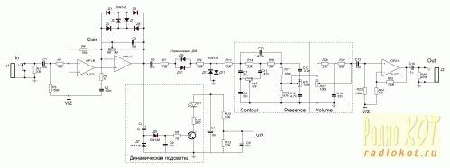 Автор: Rinon Ninqueon, stepanbelov@gmail.com Всем доброго времени суток! Сегодня на повестке дня педаль перегруза. Была поставлена задача разработать педаль перегруза с более менее плотным звуком при напряжении питания 9 вольт. Так же усиления должно хватать при слабом входном сигнале, например с синглов. По возможности фактура должна напоминать лампу. Схема Предварительный каскад выполнен на OP1:A и обеспечивает раскачку сигнала перед ограничителем. Обратная связь в первом каскаде немного нестандартная, она идёт через второй, так что не пугайтесь резистору R4. Темброблок был скопирован с Marshall Valvestate 8020. Резистором R15 регулируется полосовой фильтр в районе 1 кГц, а R19 — регулировка высоких частот. R21 — регулировка громкости с тонкомпенсацией. Так же в схеме присутствует динамическая индикация. Самый простой детектор с выходом на транзистор, в коллекторе которого стоит светодиод. Этот блок подсоединяется после второго каскада, так как там самая большая амплитуда сигнала. Этот блок можно не собирать. Резисторы R1 и R26 уменьшают щелчки при включении/выключении педали (true bypass). Питание стандартное, 9 вольт. R12 и R13 формируют половину питающего напряжения, виртуальную среднюю точку для правильной работы операционных усилителей. Стоит отметить, что номиналы резисторов R4 и R25 могут быть 100 кОм, а C2 — 150 нФ (изначальный вариант). Схему и плату в формате Proteus 7.10 смотрите в приложенных файлах. Результат Пока без корпуса, но заточено под GAINTA G0473. Между крышкой и дном будет оргстекло, которое и будет подсвечиваться (динамическая подсветка) Звук Gain При малом усилении получается очень мягкий кранч. Чуть больше усиления, и появляется нормальный перегруз. Contour Как было написано выше, это полосовой фильтр в районе 1 кГц. Presence Чем дальше в лес, тем больше высоких частот (2, 3 кГц). Семплы Стратокастер, синглы.