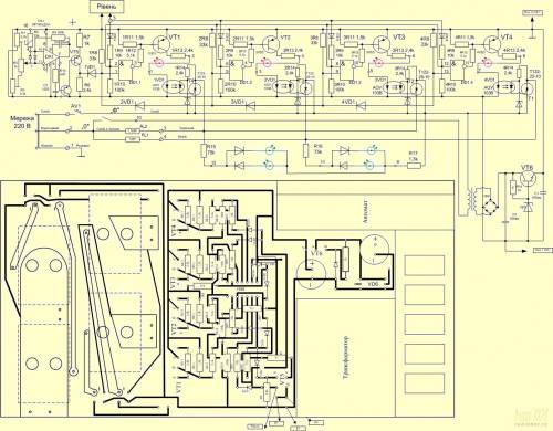 Транзисторы VT1-VT4 типа КТ501 с любым буквенным индексом. Схема защищает водонагреватель от "сухого хода". Датчик уровня воды в баке (Рівень) в виде электрода из нержавейки обеспечивает снятие напряжения при снижении уровня воды ниже верха ТЭНов. Признаю, что не всё нужное для повторения указано на схеме. Делал просто для себя. Да вот соблазнился прославиться на вашем прекрасном сайте и выдал так сказать на гора. Желающим уточнить конструкцию водонагревателя с удовольствием отвечу. Все вопросы в Форум.