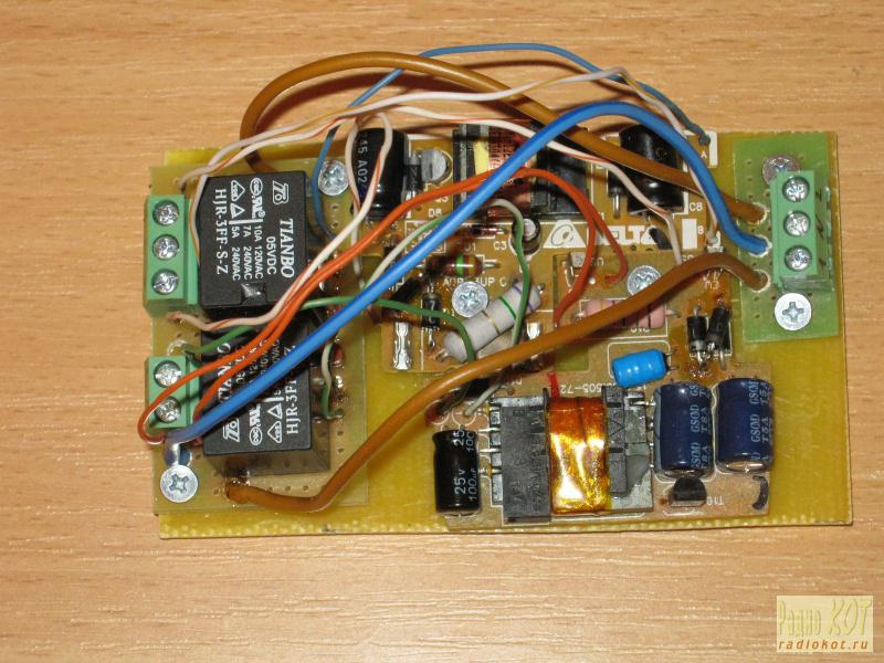 Если просто подавать полуволну после прохождения напряжения сети через два диода на нагрузку, то лампочки накаливания будут заметно мигать, да и яркость и эффективность их заметно падает. Поэтому решено было собрать схему которая будет совмещать в себе достоинства обоих вариантов, а именно - питать лампы полной синусоидой сетевого напряжения реализуя управления двумя двойными прохордными переключателями через коммутацию встречно включенных диодов. Схема состоит из двух частей: схемы включения проходных переключателей в стенах и схемы самого устройства управления. Схема включения проходных переключателей: На вход приходит три провода: L - фаза, SW1 - полуволна управления первой лампой, SW2 - полуволна управления второй лампой. Каждый из переключателей переключает один из двух встречно включенных диодов. Два проходных переключателя включены последовательно, поэтому если полярность обоих коммутируемых диодов совпадает, то на выходе (SW1 или SW2) появляется полуволна соответствующей полярности. Полуволна на выходах SW1 и SW2 подается не прямо на нагрузку, а на вход схемы управления: Смысл схемы управления в том, чтобы использовать полуволну на входах SW1 или SW2 для коммутации нагрузки. Для преобразования полупериодного напряжения сети используются две зарядки от старых телефонов (чуть разные, но очень похожие), вытянутые из родных корпусов и размещенные на общем основании. Формально зарядка рассчитана на 5V DC, но реально напряжение на выходе не стабилизировано, поэтому добавлен резистор, который согласует выход зарядки с используемым для коммутации нагрузки. Номинал резистора в моем случае составил 39 Ом, но на самом деле нужно посмотреть какое напряжение будет выдавать зарядка при токе потребляемом катушкой реле и подобрать соответствующее сопротивление для вашей зарядки и реле индивидуально (я использовал реле TAINBAO HJR-3FF-S-Z с сопротивлением обмотки 68 Ом, рассчитанное на номинальный ток в обмотке 73мА, при таком токе зарядка выдавала напряжение 7.8 Вольт, соответственно для его компенсации понадобился резистор 39 Ом). Изначально зарядки были рассчитаны на полупериодное питание (стояли диодные полумосты на входе). Но поскольку схема включения переключателей сама по себе уже подает только одну полуволну, но неизвестно какую, в полумост на входе зарядок были добавлены диоды, дополняющие его до полного моста, чтобы зарядки могли работать от любой из полуволн пропускаемых выключателями. В остальном схема и логика их работы не изменилась: В схеме можно использовать диоды (или диодный мост) минимальной мощности, т.к. ток в схеме управления не превышает 20мА. В результате получилось такое устройство (да, много проводов, поскольку использовались готовые платы от зарядок общая плата не делалась а все компоненты крепились на основу из тонкого текстолита и соединялись проводами, но в стене это не так важно, да и с "прямыми" руками всегда можно сделать лучше чем на картинке): Перед монтажом для каждого выключателя было заготовлено четыре комплекта диодных полумостов (упакованный в термоусадку на фотографиях). Смонтированные переключатели с диодными полумостами: Сам блок управления смонтирован в стене (пока еще не закрыт в распределительной коробке, т.к. ремонт еще в процессе): Работоспособность схемы проверена. Во включенном состоянии потребл
