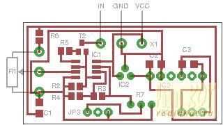 Возможно кому-нибудь из вас приходилось программировать или пусконалаживать различные промышленные контроллеры или другие приборы с унифицированными аналоговыми входами типа токовая петля 4-20 мА. В теории надо бы для таких случаев иметь специальный калибратор, но на практике часто под рукой не оказывается ничего подобного. Вот я подумал и решил собрать задатчик тока из подручных средств. Под рукой оказались: измерительная головка PM213B и операционный усилитель LM358. В результате было собрано вот такое устройство: Микросхема LM358 представляет собой сдвоенный операционный усилитель. Его первая половина вместе с транзистором T2 и резистором R2 образуют источник тока управляемый напряжением. Транзистор я использовал полевой IRLML2402, но можно и биполярный npn, например BC817 (как на схеме). Управляющее напряжение для источника тока устанавливается резистором R1. При указанных номиналах R1 и R6 управляющее напряжение меняется от 0 до 2 вольт. Соответственно ток через T2 меняется от 0 до 20 мА. Вторая половина усилителя включена как повторитель напряжения и используется для управления индикатором на PM213B. С помощью подстроечного резистора R7 можно откалибровать показания индикатора. PM213B не допускает использование общей земли у измеряемого сигнала и питания индикатора, поэтому в схеме предусмотрен DC-DC преобразователь SPU02L-05 (IC3) для питания индикатора. Если у вас не найдется подходящего преобразователя, можно просто использовать еще одну батарейку для питания индикатора. Вместо PM213B можно использовать любую другую измерительную головку или выполнить устройство как приставку к тестеру. Ниже приведены чертеж печатной платы (вид сверху. для ЛУТа нужно отзеркалить перед печатью) и расположение на ней компонентов. Печатная плата немного отличается от приведенной схемы наличием делителя R3,R4, с помощью которого можно задать коэффициент усиления второй части усилителя. Чтобы было как на схеме R3 нужно закоротить а R4 не распаивать. Разъемы JP2 и JP3 совпадают по размерам и расположению с соответствующими разъемами PM213B. Пара слов об использовании устройства: пассивные входы подключаются между выходами IN и VCC, активные (имеющие собственный источник питания) - между выходами IN и GND. При подключении соблюдайте полярность. Для питания устройства используется батарейка 9В типа "крона". Все вопросы в Форум.